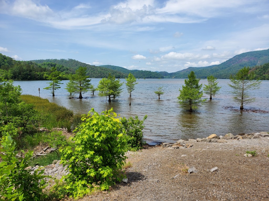 We say our goodbyes and I am off to Asheville, taking the route along the Ocoee River, both beautiful and heavily trafficked with Sunday morning recreational rafters, kayakers, and other assorted white water enthusiasts. I pull over twice, once to puzzle over trees that appear to be growing right out of the Parksville Lake Reservoir (aka Lake Ocoee, a corruption of the Cherokee word “u-wa-go-hi” meaning “wild apricot” aka passion flower).