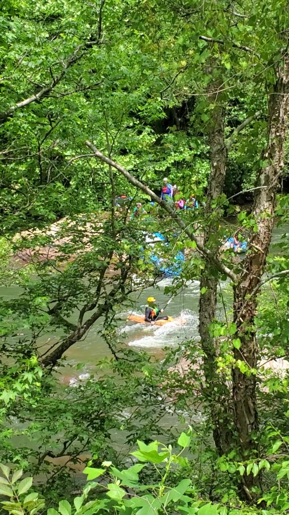 Driving further east, I can’t resist stopping again for the vicarious pleasure of watching grownups enjoying their improvised slide, synchronizing their splashing into the river to avoid the passing kayakers.