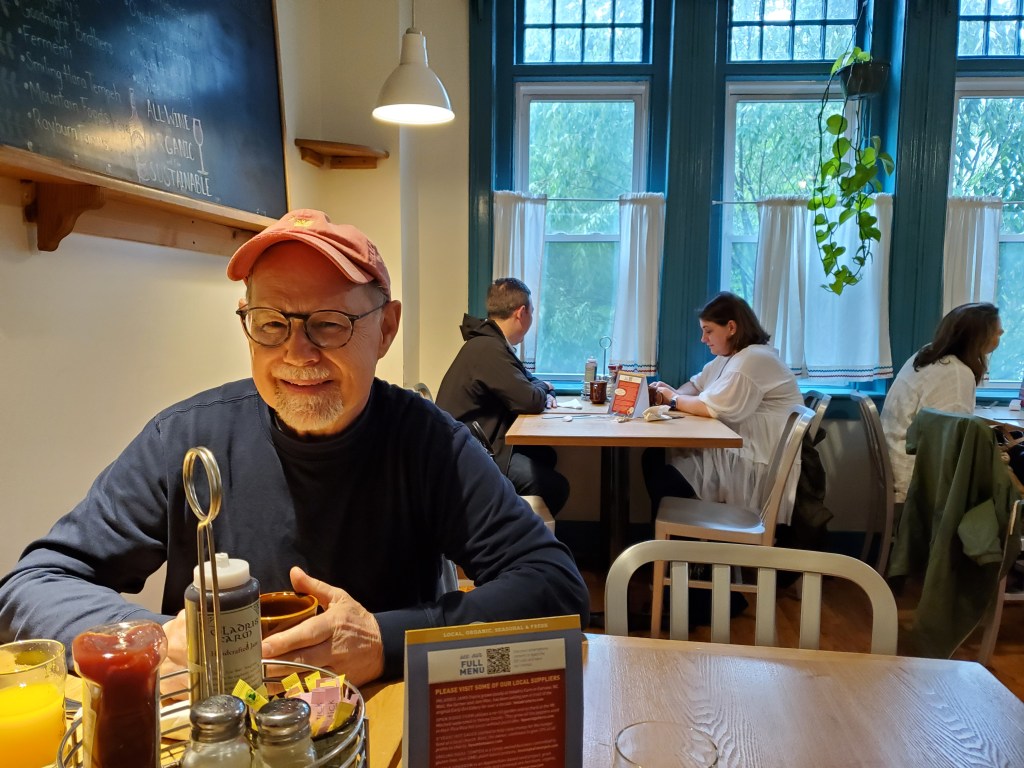 The rain has continued into the morning, but Mark, Olivia, and I nevertheless head to downtown Asheville for breakfast at the Early Girl before I return Mark to the Beaucatcher Road bungalow where he is working on installing crown molding in the living room.