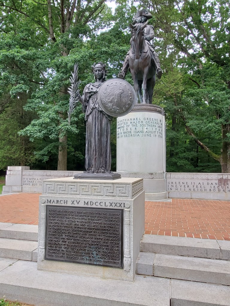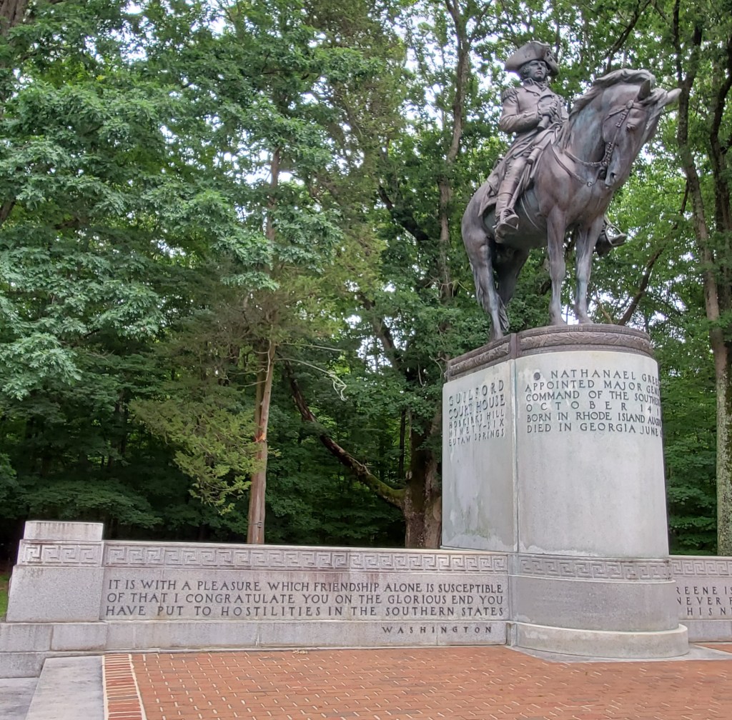 Battlefields are complex terrain, and this one, clearly favored by walkers, joggers, and bikers, is no exception. My dad, the Civil War buff, made Gettysburg and the story of Pickett’s Charge and the Angle Copse a vivid memory from my childhood: seeing the long grass of that blood-fed field ripple and part with the evening breeze as the sun sank over Cemetery Ridge conjured ghosts of soldiers marching through it to their destiny. Stopping now to read inscriptions on monuments to Greene–and to Schenck and other earnest nineteenth-century citizens dedicated to preserving glorious history—I return again to despondent thoughts of my country’s currently degraded condition. Would citizen soldiers today “fight like demons” to protect their homeland—as Ukrainians continue to do even as I type this, as American patriots once did? Does anyone even know our history? My colleague Lisa reported an undergraduate asking her whether in World War II we were allies with the French or the Germans. And so many Americans still under the spell of the grifter former president Trump believe the Big Lie that the 2020 election was stolen, remaining wedded to a delusion that no amount of carefully documented evidence to the contrary can dispel. Where are we headed, this Memorial Day weekend of 2022? What, indeed, are we remembering? The Guilford Courthouse Park leaves me pessimistically pensive.