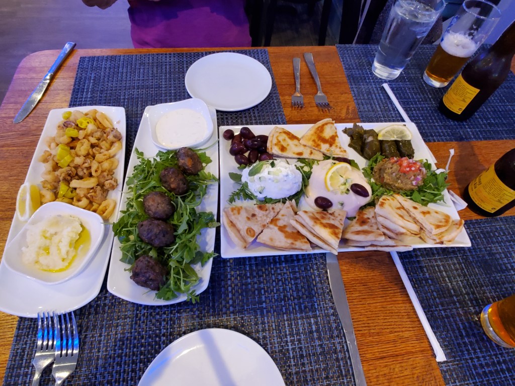 We make a quick tour of the archaeological museum just before closing time, and head back to “civilization” for a wonderful feast at Greek restaurant Keφi, a cold pikilia platter with taramasalata, melitzanosalata, and tzatziki on a bed of arugula with kalamata olives, dolmades, and grilled pita, keftedes and kalamari with skordalia accompanied by a delicious Honey Golden Ale, and finally a slice of delicious orange semolina cake, portokalopita, for dessert.