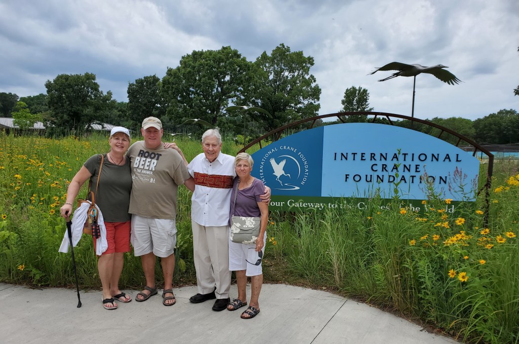 But I also feel the lack of what I found in Wisconsin: the most comfortable bed ever, appointed with feather bed mattress topper and beautiful white trapunto spread and pillow covers; a spotless, beautifully furnished and efficient home layout; the company of a loving family (oh, to be in such good company now in my third year of solitary widowhood!); the generous, efficient, observant domesticity of two other women; the ongoing good-natured teasingly performative competition between two men of different generations; the relaxing pleasure of happily being not in charge, but instead following the lead of my hyper-capable and competent retired Army/Foreign Service nephew; the liberating hilarity of back-seat “chicas” struggling to buckle seat belts into receptacles exasperatingly located underneath the cheeks of the little woman in the middle; new, gently rolling landscapes of corn and crops of varying greens; new ways to be in the world; sandhill cranes; family stories: histories filled in; tales of fences mended—and not; tales of what gets talked about–and what doesn’t. Tolstoy got it wrong: all happy families are not alike, nor is each unhappy family unhappy in its own way. Somewhere in the spectrum from the Cleavers to the Simpsons, all families are unique. I am lucky to be part of this one, and to have had the time we did together.