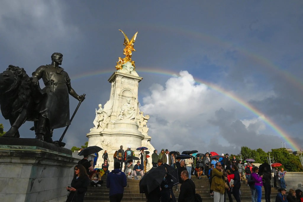 As the queen’s death was announced on Thursday, two rainbows were visible to crowds gathered near the Queen Victoria Memorial outside of Buckingham Palace. 8 September 2022 / Photo by Toby Melville / Reuters