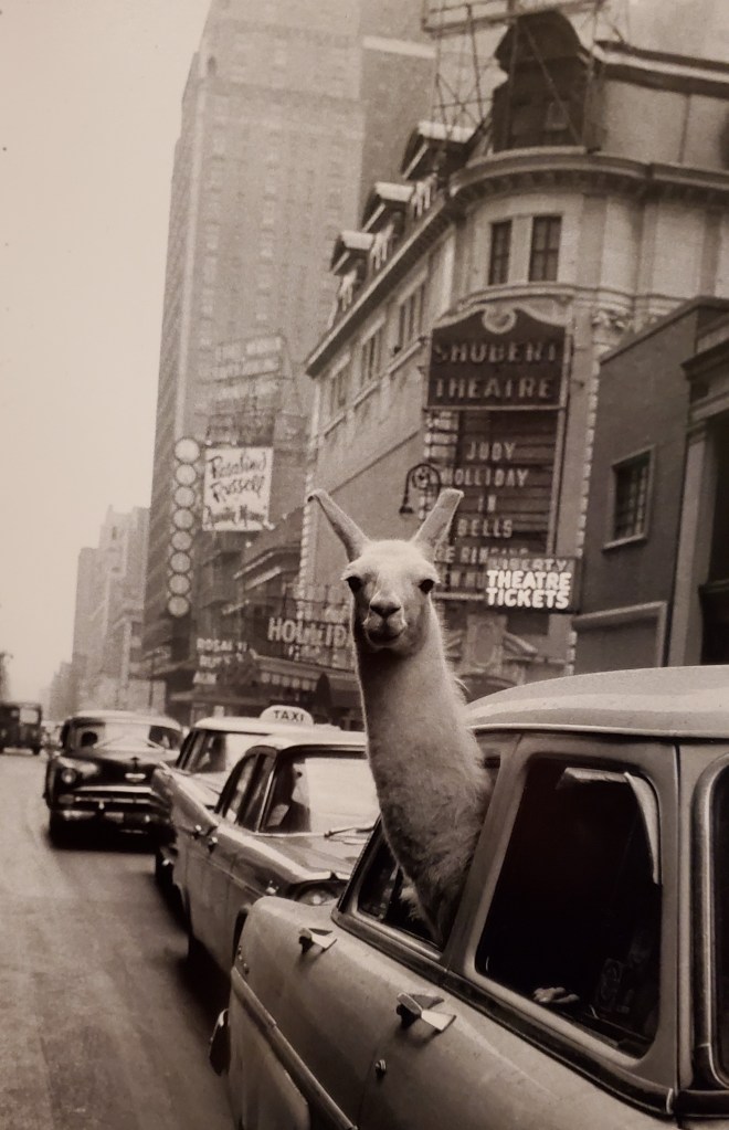 The current big show is the extraordinary bequest of Judy Glickman Lauder, whose photography collection is one gangbuster image after another. From Dorothea Lange’s iconic Migrant Mother, to the painfully moving shot of hope in an old woman’s face as she looks up to RFK, to the whimsical juxtaposition of a llama riding in a car through Times Square, this show fascinates—and suggests, as Brian pointed out, the clarity of an earlier era’s vision, devoid of the ambiguity and irony more currently prized.