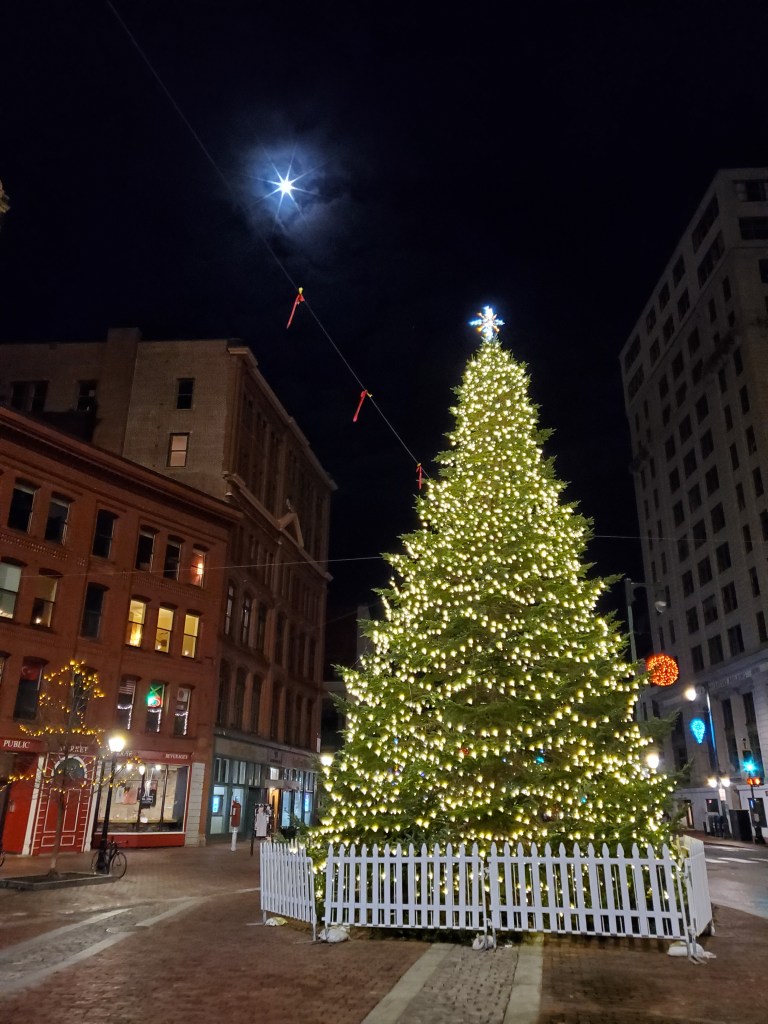 Portland’s Congress Street was bustling with artisans hawking their wares as we strolled through the early dark illuminated by Christmas lights to dinner on Monument Square. Such fun.