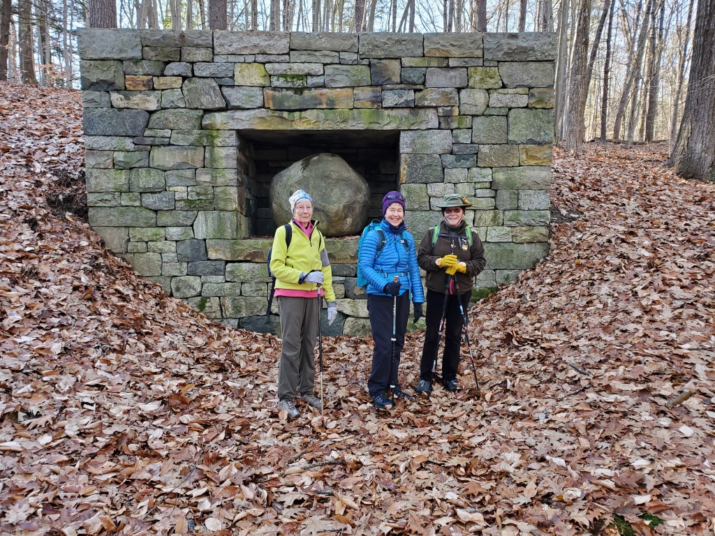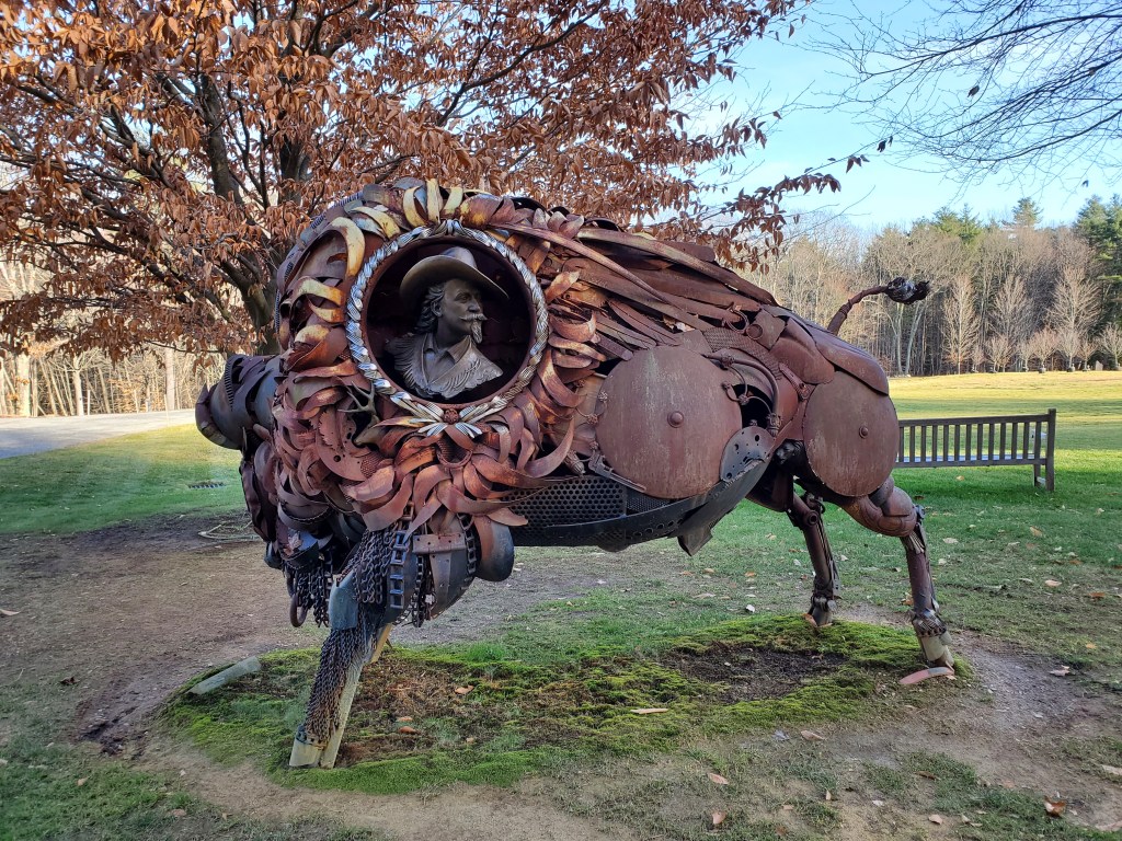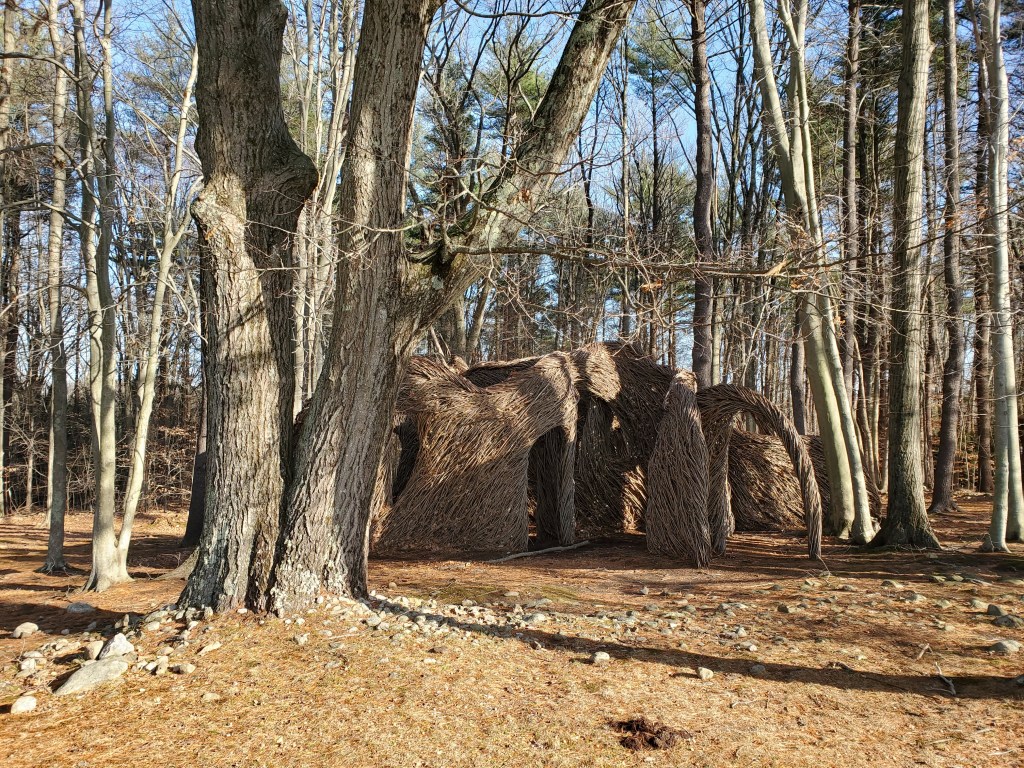 Still under the spell of those PMA images, I went on Monday for a stroll (by invitation only) through the woodlands of Alnoba in Kensington NH, “a destination for retreats, leadership, and wellness” conference center with a remarkable collection of sculptures placed throughout the property. This was my first two hours of negotiating a trail covered by slippery leaves since breaking my ankle at the end of October, but hiking stick in hand, this proved do-able, and the works were intriguing—especially the ones that invite you inside them.