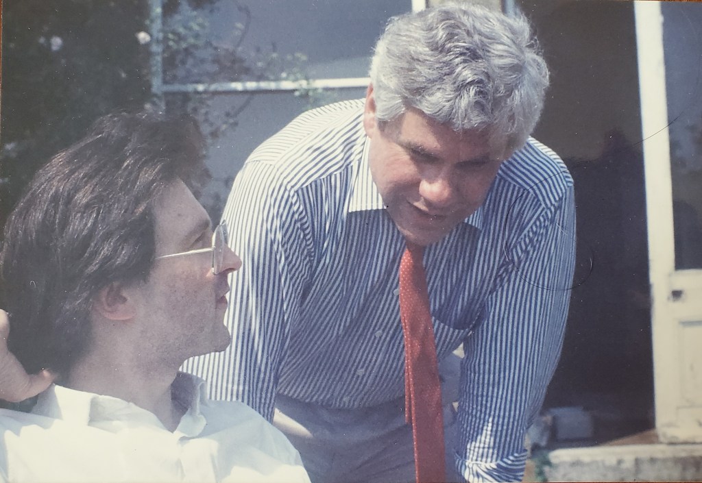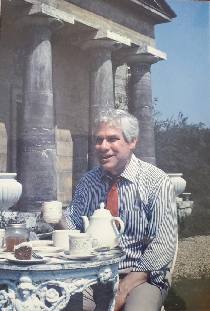 On our first Fourth of July together, 1991 in England, David rented a car and drove us to visit Hammerwood Lodge near East Grinstead in West Sussex, one of the first houses in England to be built in the Greek Revival style and in 1792, Benjamin Latrobe’s first independent work. America’s first professional architect, Latrobe would go on to modify William Thornton’s original design for the U. S. Capitol, so Hammerwood was an appropriate July Fourth destination for us Americans abroad, so recently having reversed Latrobe’s transatlantic passage. Deploying his signature charm in such circumstances, David, dressed in jacket and tie and armed with Nikon, was shooting slides of the Hammerwood façade to show in his classes, UNH business card at the ready. His gradual approach first piqued the interest of and, on introduction to my dear architectural historian professor, so flattered the Lodge’s owner, David Pinnegar (a physicist with an Oxbridge stammer and a wonderfully enthusiastic nature–he literally jumped for joy), that he invited us inside to look and then take tea on the terrace with him and his mother.