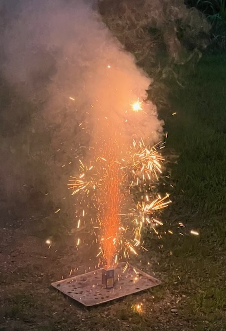 After the main course, the five guests plus my great neighbors Anne and young Leo adjourned to the deck to view my little fireworks display.