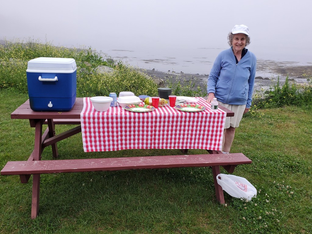 Then yesterday, 8 July, my friend Vicky and I made our way to Great Island Common on New Castle for a small evening picnic at the beach. On arrival, a thick, very wet fog threatened to douse that plan. But a brief stroll along the beach dispelled our fears, and the water I waded was warmer than I’d ever experienced, even as the fog made the nearby lighthouse invisible. A large diesel engine thrummed from an equally invisible vessel perhaps making its way to the mouth of the Piscataqua as a lone cormorant played the Loch Ness Monster in the mysterious murk and the foghorn made its periodic moan. Very Eugene O’Neill, all this salty, thick air. Quite enchanting. And all the more so when two dear friends unexpectedly emerged through the mist, Carol and Barry, who was making his outdoor debut following ankle surgery, carefully circling the Common with his afflicted foot in a boot resting on a rather high tech scooter. A happy meeting this; serendipitously lovely conversation ensued before Vicky and I settled in at picnic table with our lobster rolls, watermelon salad, and citronella candle as lone picnikers, soggy but undaunted, enjoying the limited, dreamy ocean view.