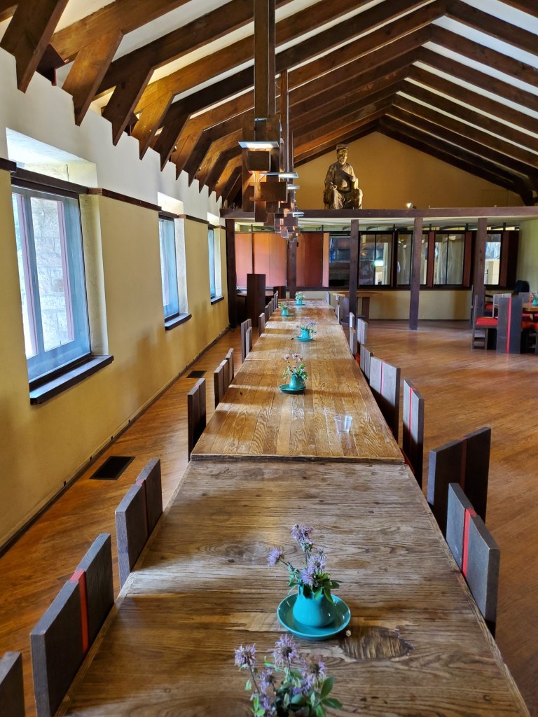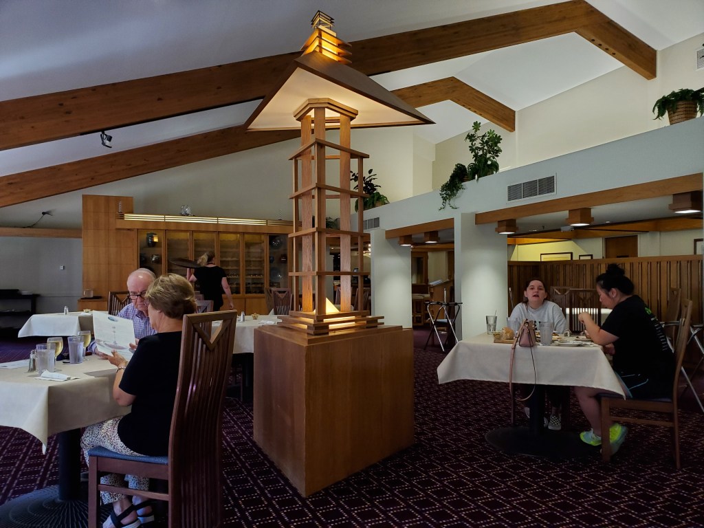 At noon I reached the Spring Valley Inn, first designed in the early 1990’s by the Taliesin and Frank Lloyd Wright Foundation as a visitor’s center and later purchased by the current owners, John and Patricia Rasmussen, who along with Charles Montooth, apprentice to Wright and member of the Taliesin Associated Architects, turned that visitor’s center into the Inn’s handsome reception area and lounge, constructed the extant 35-room hotel, and in 1994 adding a capacious indoor pool and conference room.  All the furniture and appointments were designed by Taliesin architect James Pfefferkorn and built by local Master Craftsman Rick Kraemer.  For Wright aficionados, this is certainly the RIGHT place to be.