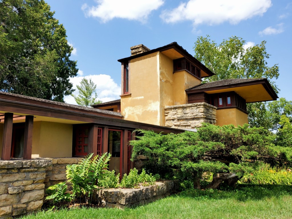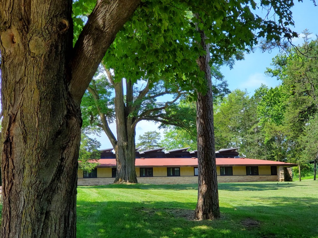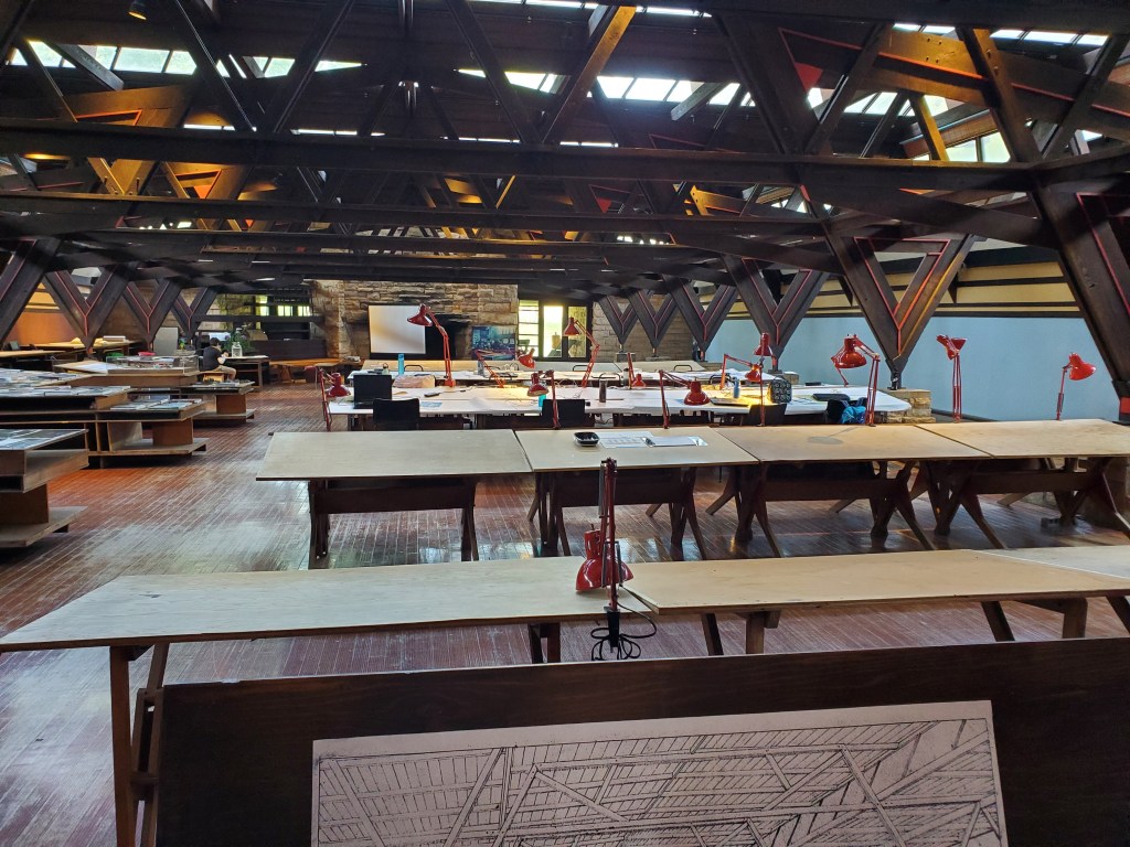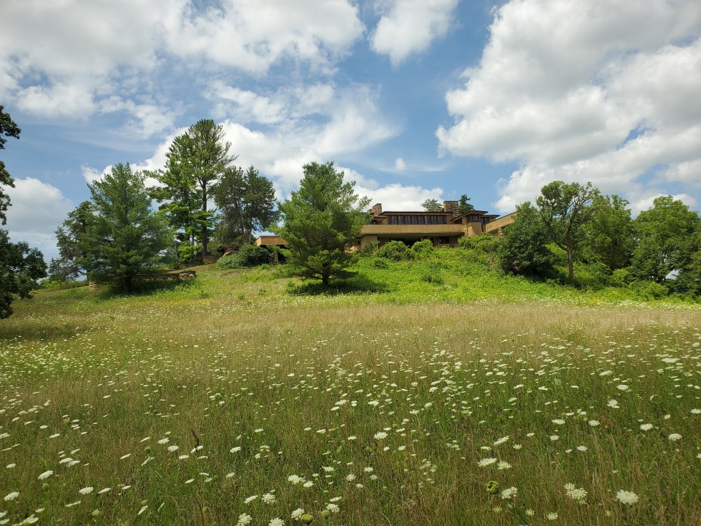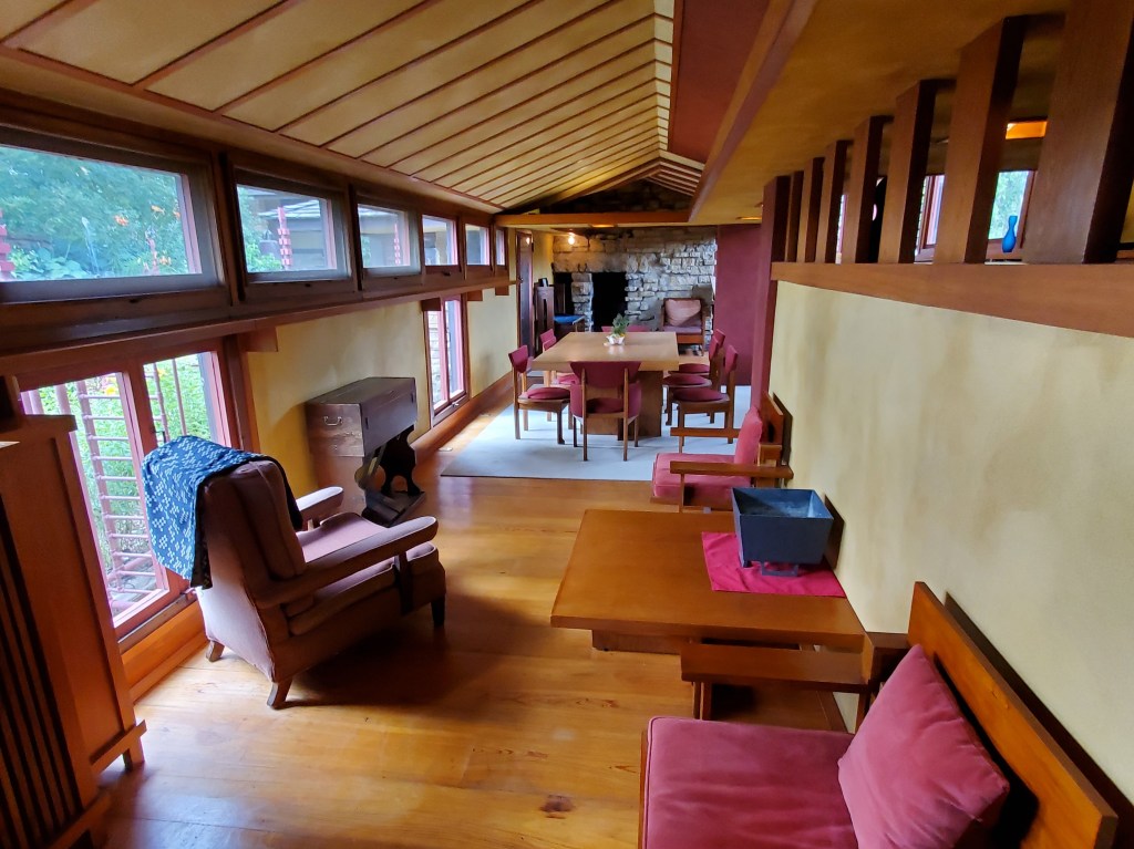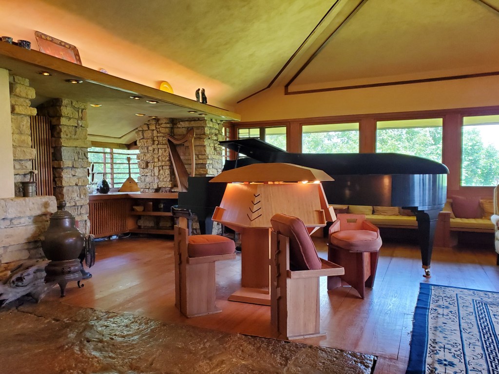 After breakfast we headed out to Taliesin East for a two-hour tour led by a very well-informed and appealing docent, Ben, a Wisconsin-born farm boy (he reported he’d done his share of tasseling the corn crop) transplanted to NYC.  A shuttle bus drove us around the Taliesin property, now a UNESCO World Heritage Site, and Ben led us through both the Hillside Studio and Taliesin itself.