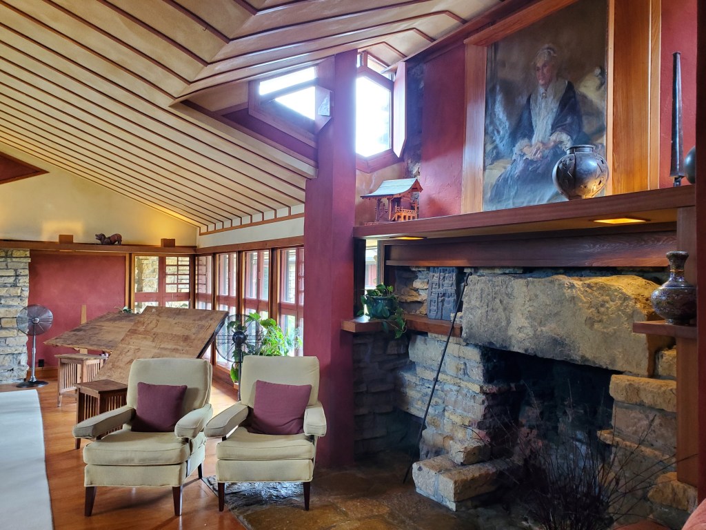 The hearth at Taliesin, with portrait of FLW’s mother, Anna Lloyd Jones Wright
