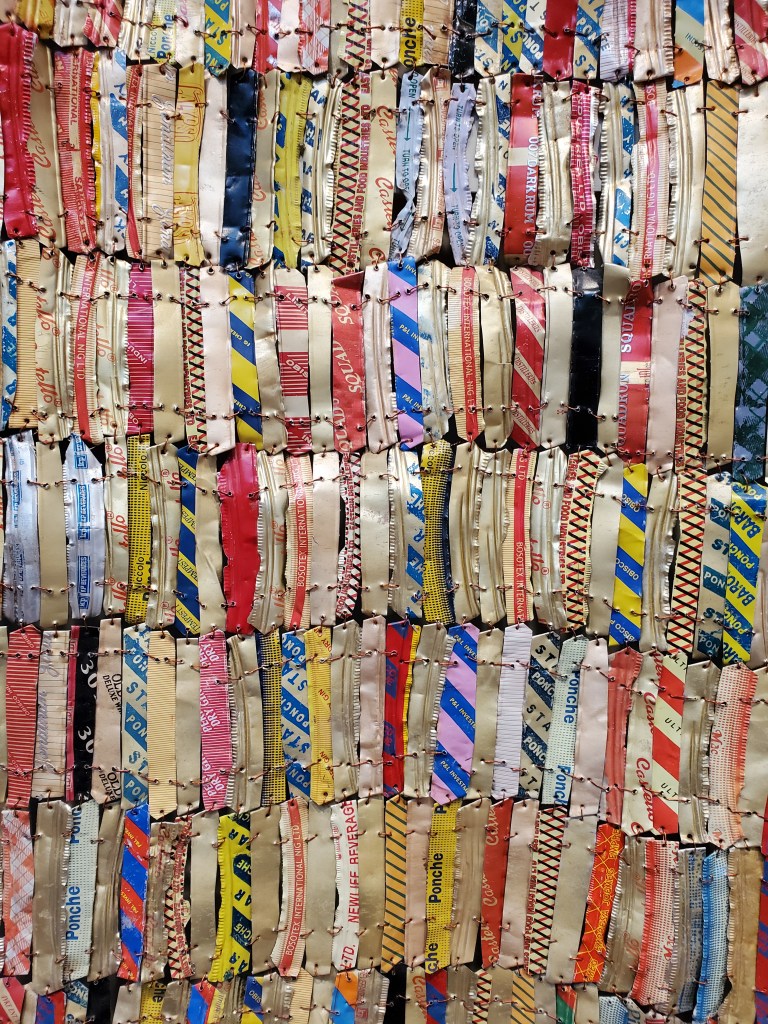 Wall hanging by El Anatsui (Danu, 2006), made of aluminum cans and copper wire