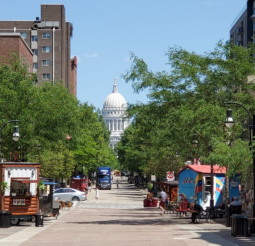 Next morning my friends headed back to Iowa City and I drove east to Milwaukee, with a brief stop in Madison to visit the U of Wisconsin’s fine Chazen art museum and remark on the symbolic layout alumnus Ed had made clear to me:  The Capitol on unimpeded axis with the central University campus:  learning and government on equal footing.  Would that balancing act still obtained across our nation.