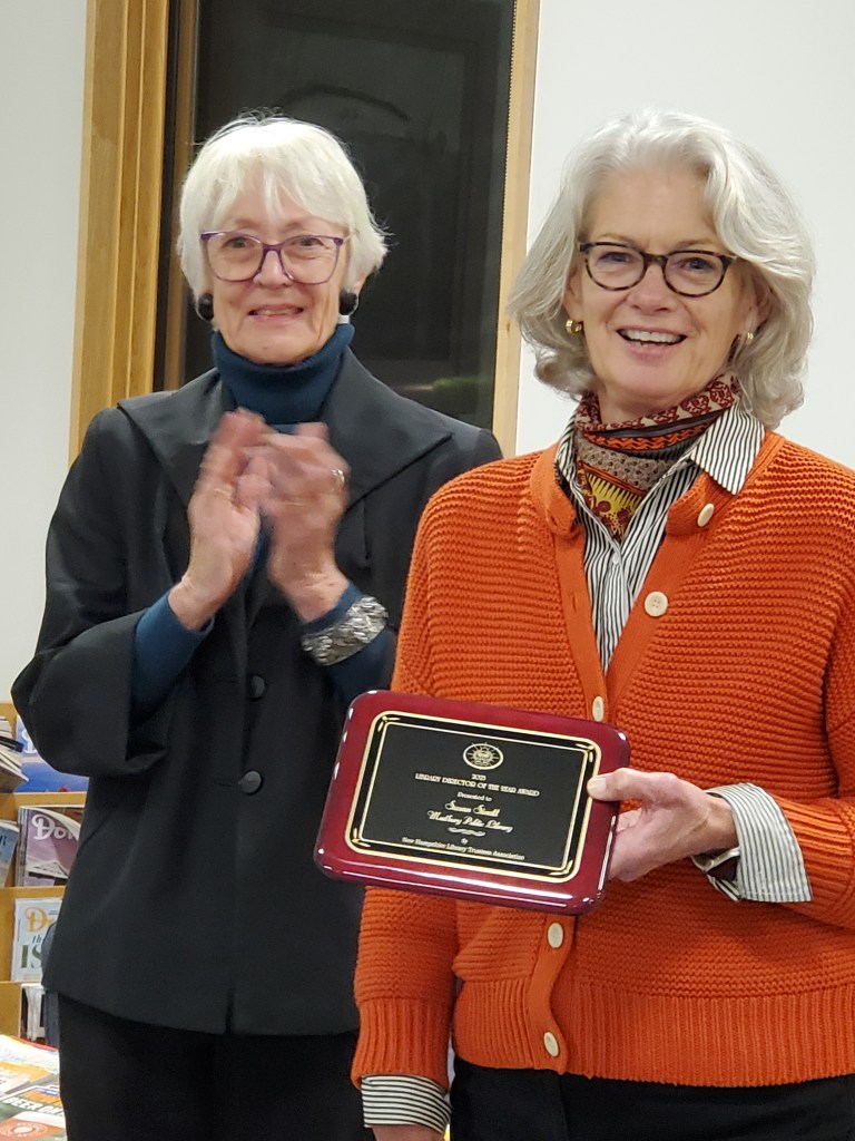 The next Monday, 16 September, brought a delightful opportunity to celebrate someone else: Susan Sinnott, Director of the Madbury Public Library, where since last April I’ve been serving as an alternate trustee. Nominated by us trustees and now in her 10th year of serving Madbury, since 2019 in the lovely new library she helped establish, Susan won this year’s NH Library Director of the Year award offered by the New Hampshire Library Trustees Association, further distinguishing the MPL among the other 233 NH libraries. So gratifying to see the hard work of a saavy, modest professional appreciated for the talented helper she is.