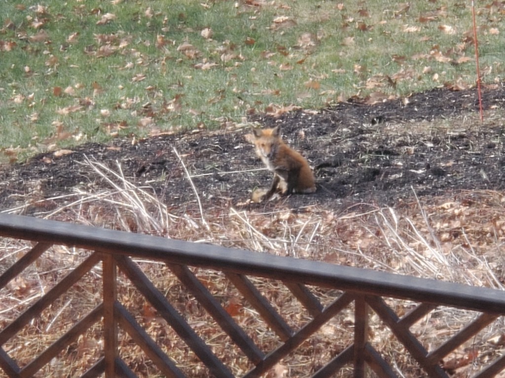 Having generously driven me to the hospital and kept me company while awaiting the Main Event, my friend Jennifer then drove me home, where I went back to bed. An hour later, rising once again to peer out the window, I saw an oval of red fir in the mulched west-facing flower bed. Grabbing the binoculars I keep handy on the sill, I saw the red fir stir and reveal a fox was napping there, its bushy tail wrapped around its body. I opened the window ever so quietly to get a photo, and took several shots with my phone before my toe bumped the baseboard heater cover and made enough noise to prompt the fox to look my way, stand, stretch, and head for the woods at a leisurely trot.