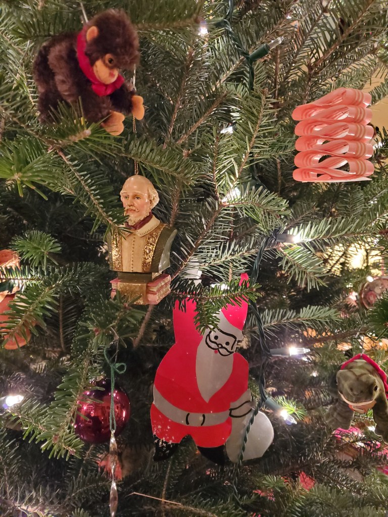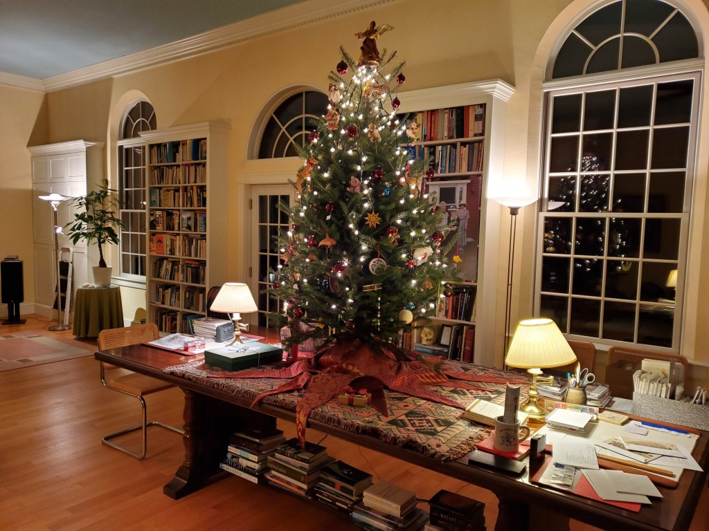 Then came a walk up and down Hayes Road on an uncommonly warm December day, followed by my evening’s introduction to the exceptional talent of Seacoast singer/guitarist Susie Burke and the fine musicians completing her trio, Kent Allyn and Steve Rob at the Durham United Universalist Fellowship. The set was a remarkable hybrid of witty holiday music, both comic and poignant, and folk favorites, including some terrible puns and Allyn’s hilarious Jimi Hendrix/Vince Guaraldi wa-wa reverb mash-up of “Christmas Time is Here.” Obviously deeply grieving the loss of her partner David Surette in December 2021, Burke’s performance frequently evoked her David’s presence by name, his music, and a performance by one of his students. The Gemütlichkeit in the wood-warm round of the church’s community room was palpable in the audience’s ready, easy, and occasionally funny response to the familiar and so-talented performers. My hosts Ed and Maria secured the good feeling afterward with a delicate peach galette and some superior Vin Santo. Another reinforcingly good day.