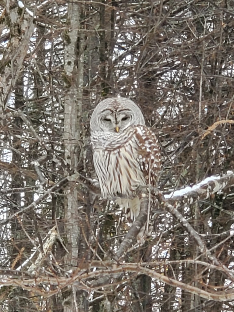 The path to this cadence had been less than enjoyable. After a rather miserable previous day of forcing fluids and being hungry (an ever-so-slight reminder of a chronic condition the less privileged suffer), followed by a night of intermittent waking and jet-propelled expulsions, the first thing I saw on parting the bedroom curtains at dawn was my resident barred owl, George, perched sleepily on a low branch of the fir opposite. As I’ve mentioned before, a barred owl’s “who cooks for you” cry in April 2002 had followed hard on my mother’s early morning phone call reporting news of my dad’s passing; all owls have been George ever since. So this glimpse of George I construed as a reinforcingly good omen as I faced a morning at the hospital.