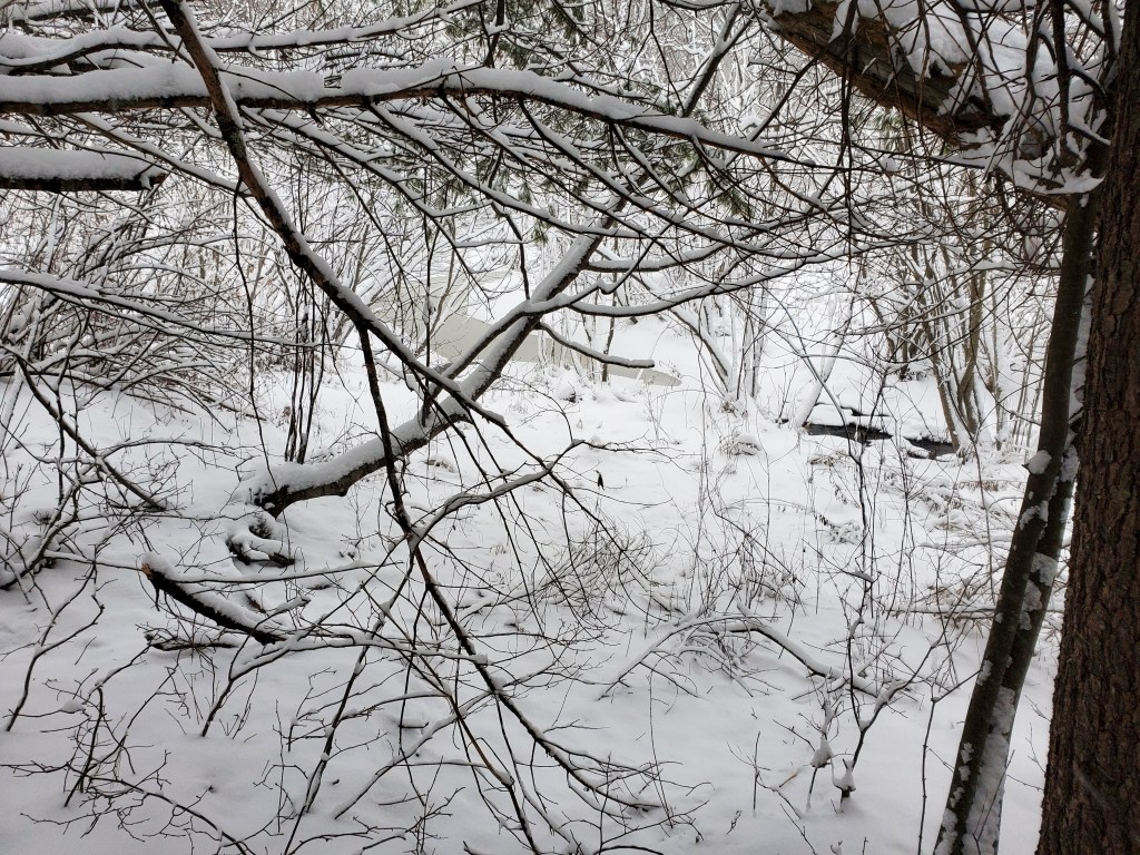 The warm, festive glow of my little 2023 Christmas tree is no more now that Twelfth Night has come and gone, and the tree rests, au naturale and snow covered, on the deck.  The library sans decoration now seems both larger and more desolate.  Some compensatory cheering arrived on Sunday the 7th as we at last got our first sizable snow, and I took advantage of the midday lull between storms to find my snowshoes, suit up, and hit the woods, using the bend of the Oyster River tributary that defines our property to guide me now that the trail David and I blazed so many years ago with chainsaw and loppers (but never since groomed) is largely indistinguishable.  The two substantial boulders, Ralph Waldo and Henry David, remain just where the Ice Age left them, of course, durable landmarks however snowcapped.  So many large old trees are now down that skirting them requires more going ‘round than stepping over, but proving that I could still enjoy a snowy trek in our woods was both salutary and satisfying.  The afterglow made me feel it might be possible to (mostly) maintain my resolution to be more optimistic this year, despite all signs that signal disaster.  Last week I watched the new Netflix film Leave the World Behind with Julia Roberts in an uncharacteristically sour role and Ethan Hawke as an all-too-painfully-recognizable NPR-listening dweeb utterly lacking any of the survival skills necessary to cope with all the failing systems the plot offers.  A very dark comedy, that.  Guess it’s good to laugh at the scenarios I suspect any thinking person contemplates in our near future.