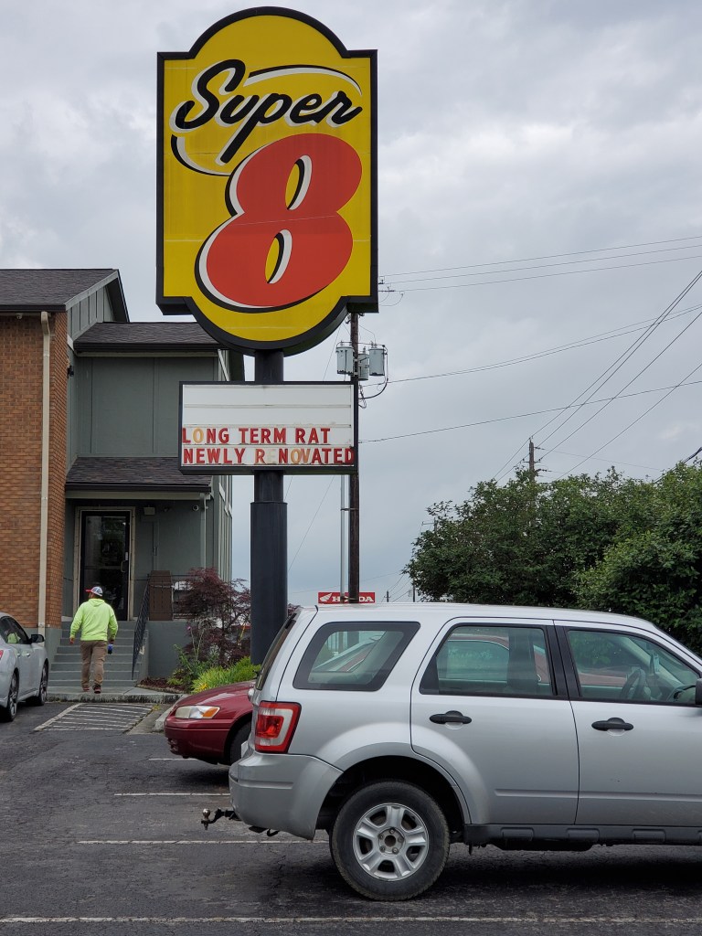 This time I-40 served up a blinding rain storm; again I survived, however exhausted. I stopped at the nearest Arby’s for a jamoca shake to celebrate/wake me up; the girl behind the counter automatically gave me the senior discount, so I’m sure I looked as sorry as I felt. Sleepiness mandated my stopping again in a very hot high school parking lot, but the car was now too packed to allow my seat to recline, so I just had to persevere until I reached Danville and pulled into the Super 8 motel I had reserved. Advertised online as “newly renovated,” that past tense was clearly aspirational. The room I asked to see (a first for me) had a tv with no remote, and the hallways were filled with remodeling detritus. Seeing my expression, the young clerk offered me my pre-paid money back. Only then did I realize that the Wednesday I had arrived in Danville was the Wednesday before Centre’s graduation—the third of my trip—and I feared there would be no rooms available elsewhere. A quick check at the next-door Holiday Inn Express DID oblige, however, and though I didn’t remember to ask for either my AAA or AARP discount, and once in the room discovered I’d left both my umbrella and my beloved L L Bean spreader knife back at My Happy Place, I finally had a place to rest. I then got my money back from the “Long Term Rat” receptionist, who confessed she was embarrassed by the state of her mis-represented workplace. I got a baked potato from the nearby Wendy’s—a frequent practice during my early days in Danville—and at last got a good night’s sleep.