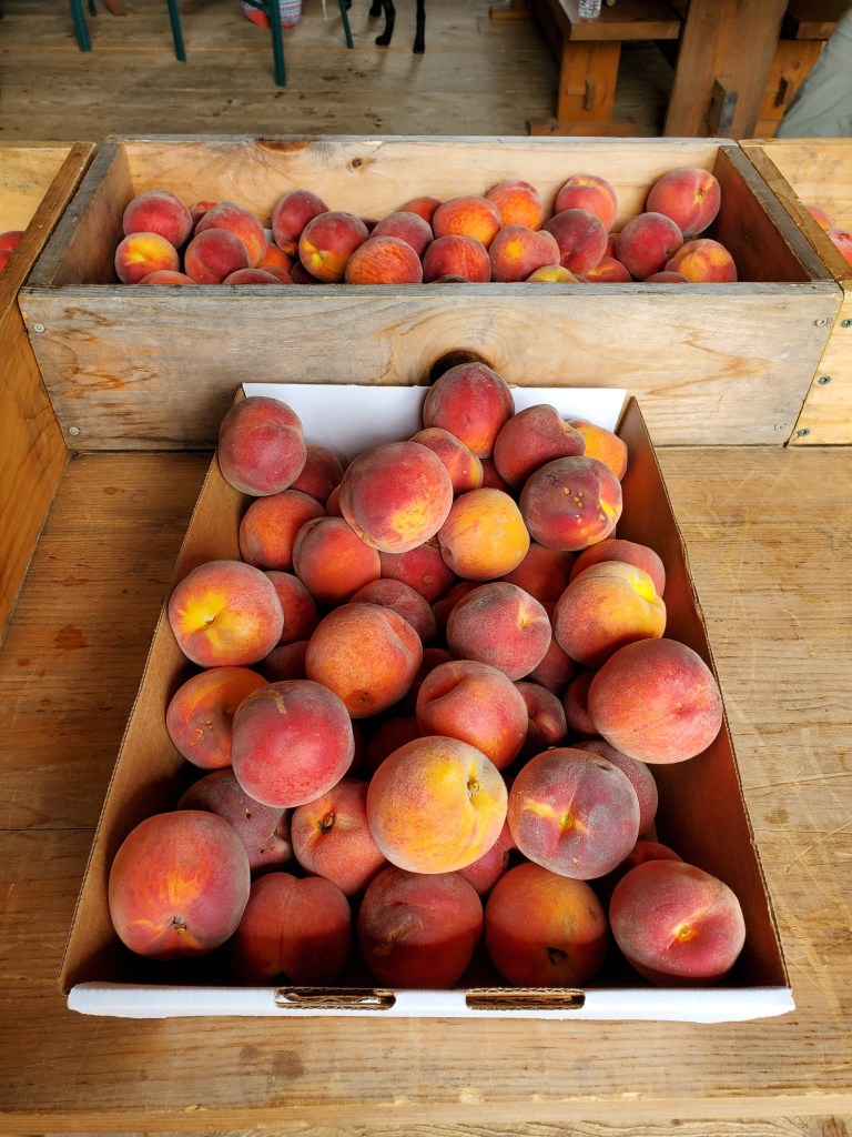 There’s certainly a story there. The final errand: getting peaches from the Union Lake Orchard in Barrington NH, a pleasure delayed by a year due to the killing frost in the spring of 2023 that wiped out crops across NH and MA. The postponed pleasure has been even sweeter as a result.
