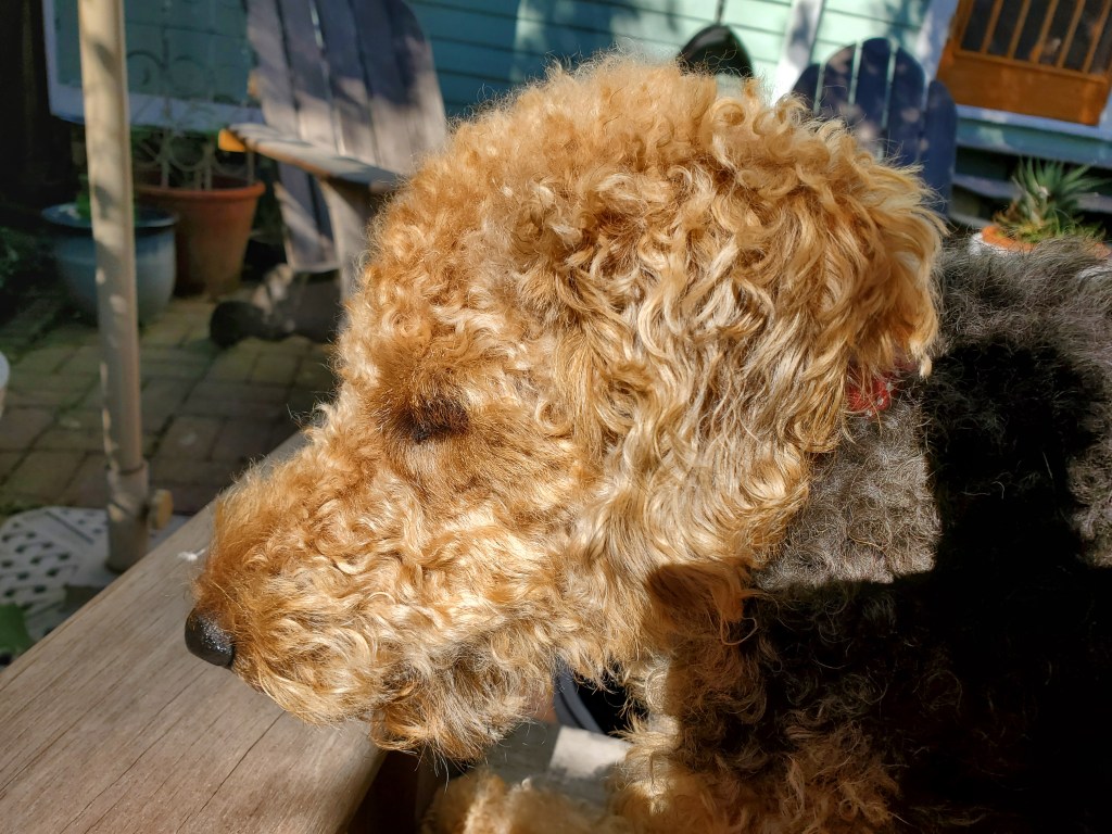 The ride back to Bayou St. John was enhanced by more colorful characters, some locals and some tourists, one of whom, an Indian gentleman, I had to reassure when the car stopped at Canal and Carrolton and the conductor got off to manually change the trolley pole to draw power from the overhead wire. 1893 technology, that. Back on DeSoto, Trish and Mike took adorable Dora for a walk while I rested on their charming sweet olive-scented patio.