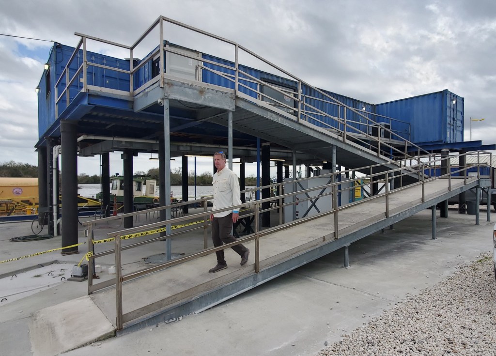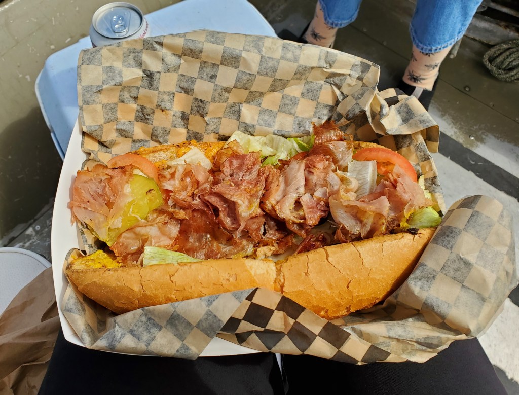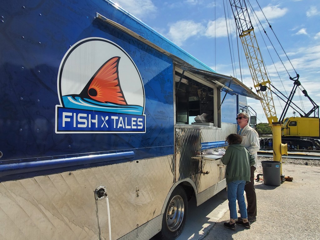 Part one of the adventure was a drive through Chalmette, Arabi, Violet, and Alluvial City (Alluvial City!) on the west bank of Bayou La Loutre in St. Bernard Parish, cruising in Mike’s truck past all the raised fish camps to the Hopedale Marina for a guided tour of some favorite fishing spots and lunch on the water courtesy of the Fish Tales food truck. (Chef Mike enjoyed tweaking Chef Patrick about the quality of cheese on the ham & cheese po’ boy.)