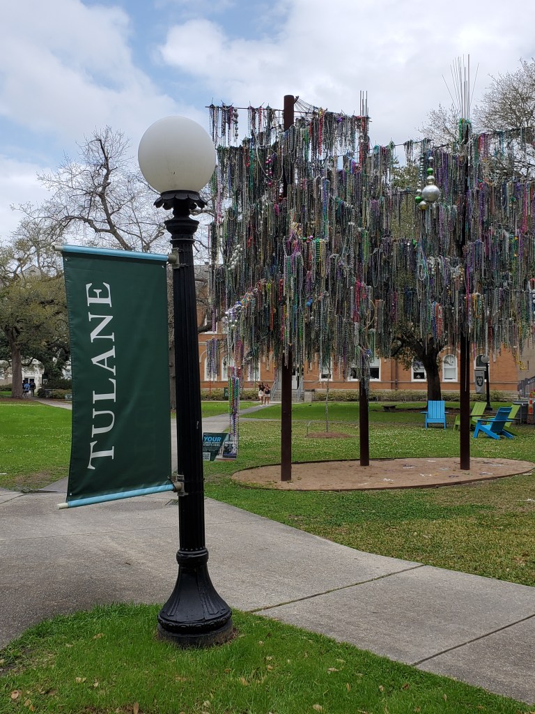 I strolled up to the Howard-Tilton Memorial Library where I’d spent so much of my last year in New Orleans, noting along the way lots of colorful Adirondack chairs scattered around the campus, and a bead tree sculpture, signs of frivolity absent during my grad school years.