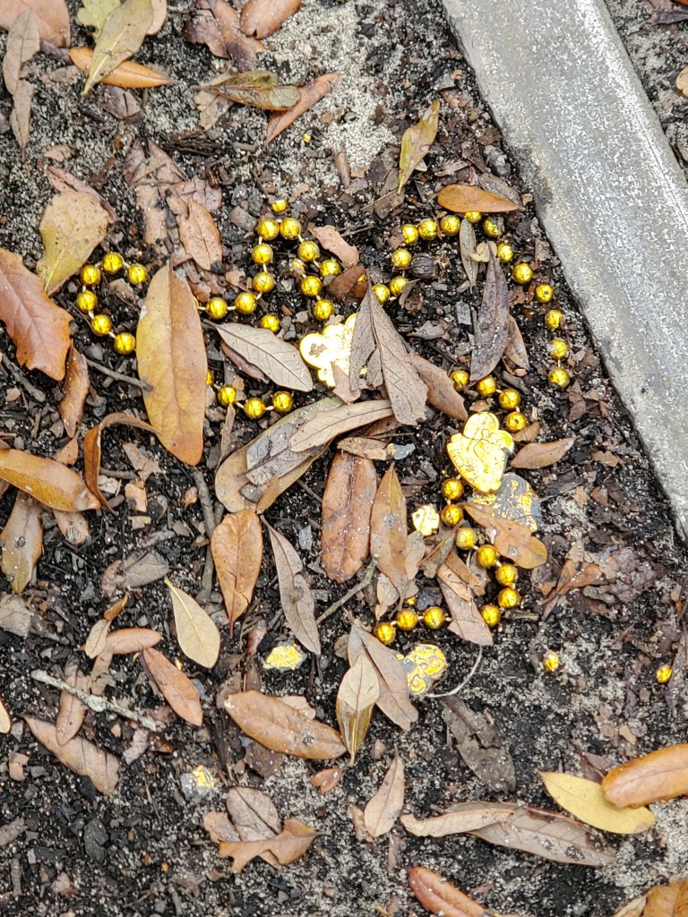 There I waited quite a while, first with a young mom and kid who eventually just set off again on foot, and then with two others until a third would-be rider, a very skinny fellow with very few teeth, came hobbling up, assisted by a four-footed cane, and carrying a plastic bag, a handful of Mardi Gras beads, a couple of books, and some printed-out pages. This little man returned by greeting and, after offering me some beads, began a very well-informed conversation about Dolly Parton. The pages, he said, were all about her, a woman he really admired, and he cited statistics about her age, how much money she gave away, how many people visited Dollywood each year: a proper fan, he. He told me, too, that there would be more parades the next day, Sunday. I thought him deluded since Mardi Gras had passed, but later learned he was right that some trucks would roll on the morrow.