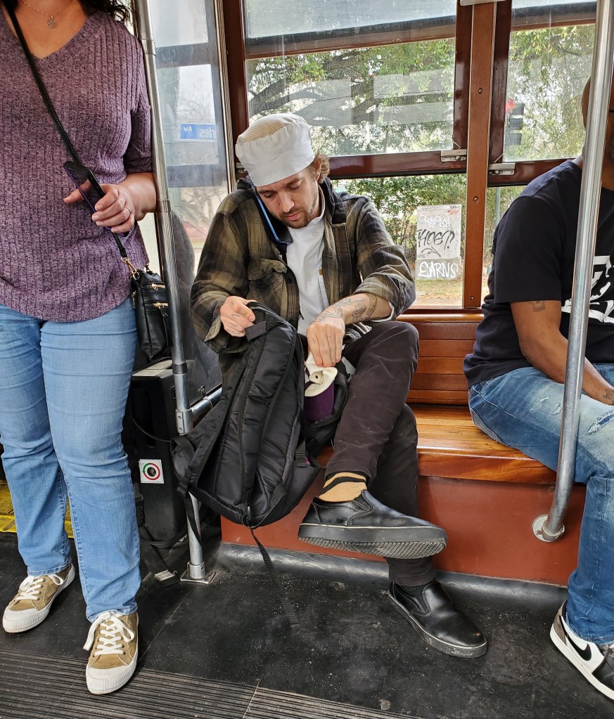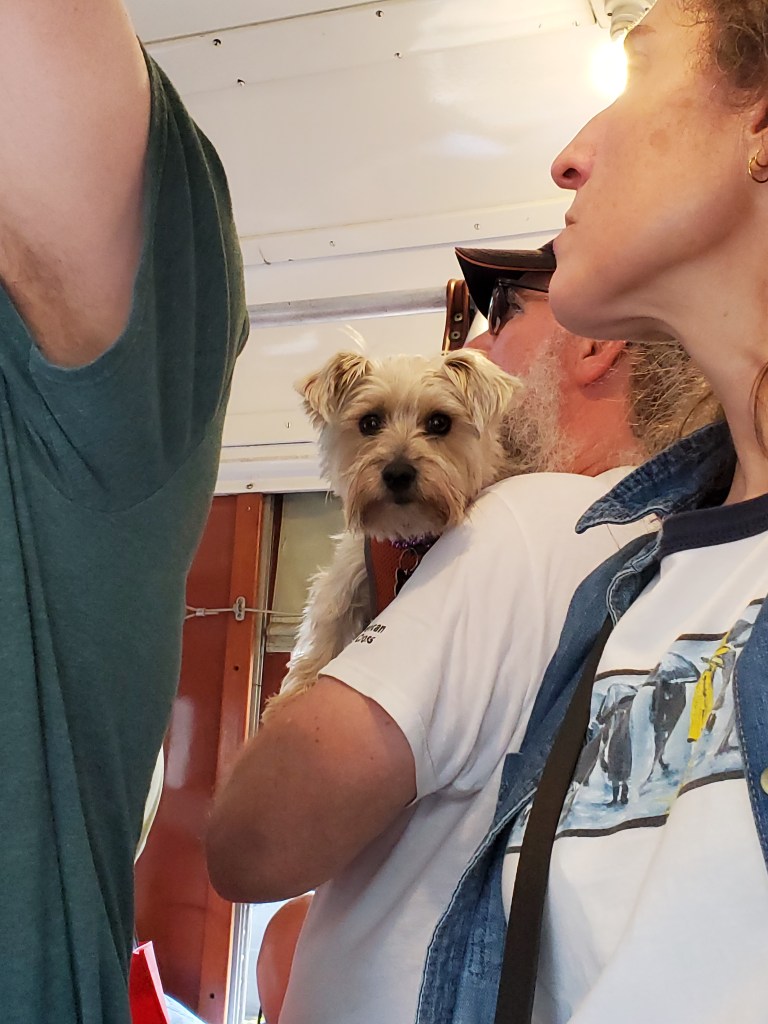 When the streetcar finally arrived, the other two passengers boarded first; I deferred to my chatty companion, and waited behind him as he struggled to manage his cane, his burdens, and his beltless pants. When he stepped up, he was greeting by the conductor, who handed him the pass which he’d apparently left behind on an earlier ride. That additional item to manage proved too much, however; he dropped both his cane and his pants, which fell to his knees revealing a white diaper just in front of my face. Nonplussed about how to help, and reluctant to offer a boost to that diapered bottom, I hesitated. But my embarrassment on his behalf was short lived; the conductor immediately left his seat, got down off the car, and helped the man up with his pants and onto the car, settling him before asking him how far he was going this time. The man replied, “Just to the next stop.” There he did indeed disembark, once again forgetting his pass but leaving the rest of us rather relieved, and me in awe of the respectful courtesy of the conductor.