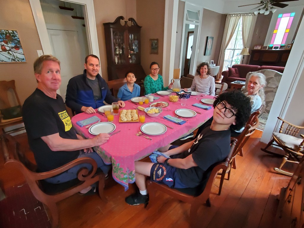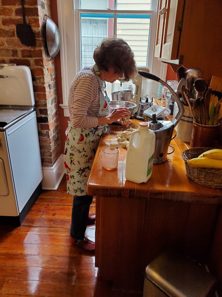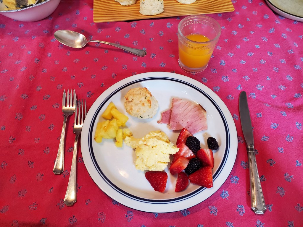 What remained of my NOLA sojourn was a lovely Sunday family brunch of Trish’s perfectly textured chive biscuits, ham, eggs (at $12.27 / dozen!), pineapple, and berries; my small contribution was happily juicing the fragrant oranges with a very efficient motorized juicer.