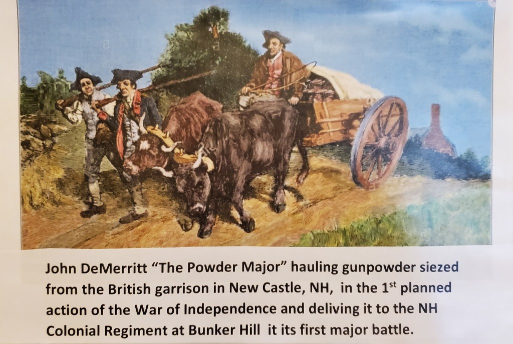 And, finally, there were all the lessons I recently learned about New Hampshire’s fabled Powder Major, John De Merritt, who after the 1775 raid on Ft. William and Mary in New Castle, NH, seized British gun powder, stored it under the floorboards of his Madbury barn (having dug a trench for a fuse that would blow it all up should the British discover its whereabouts), and then drove it by ox cart to Bunker Hill, where it enabled the Rebels to hold their position against the Redcoats.
