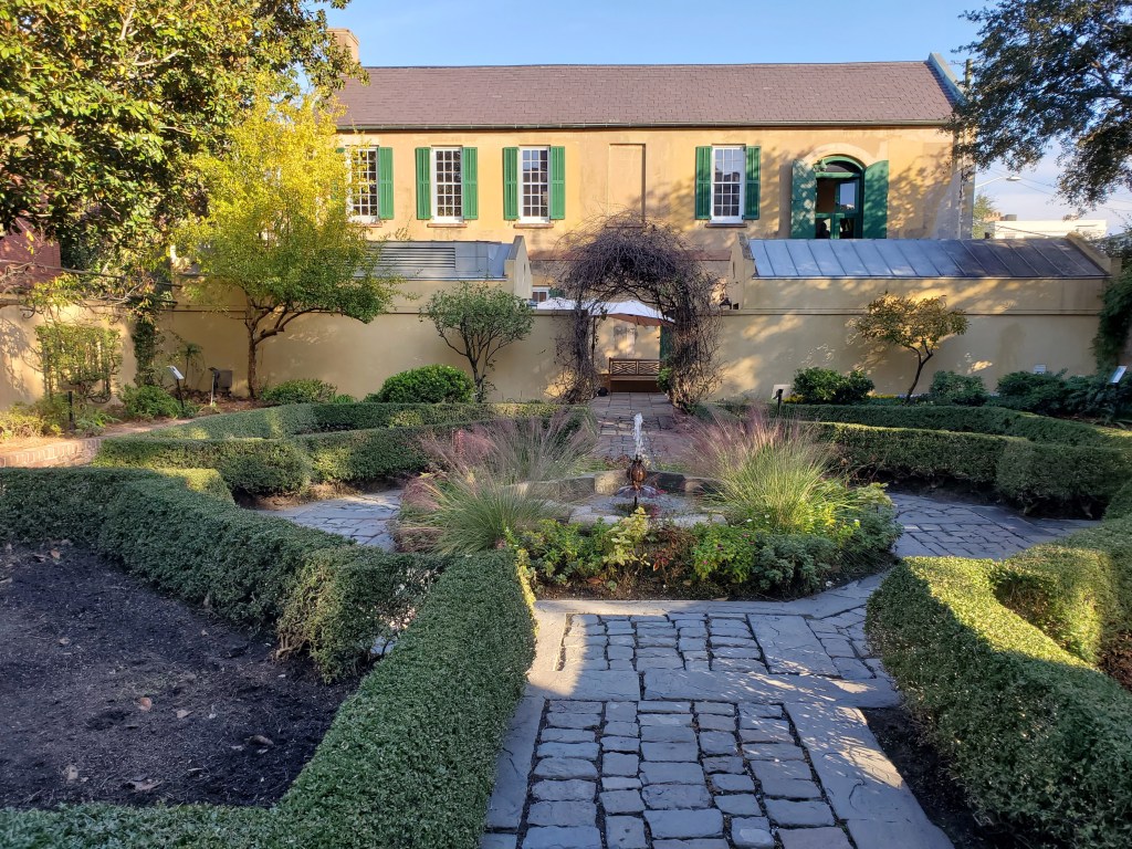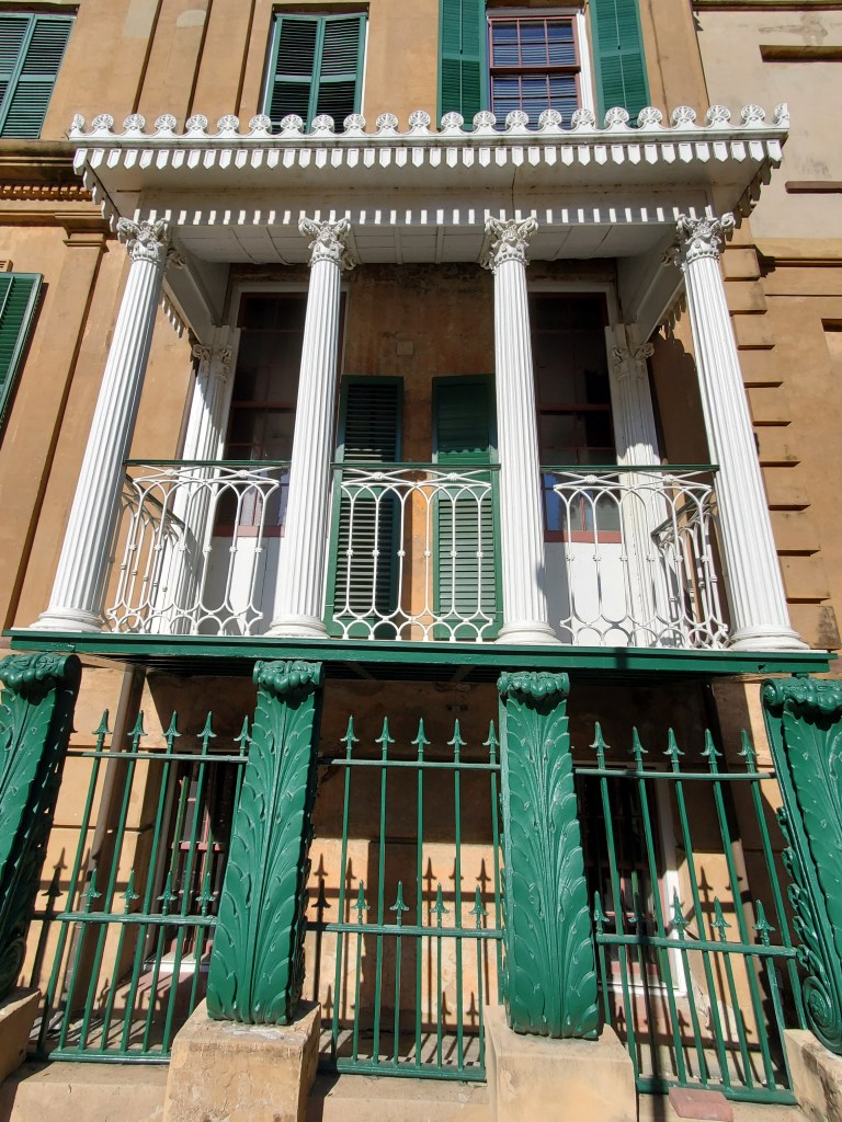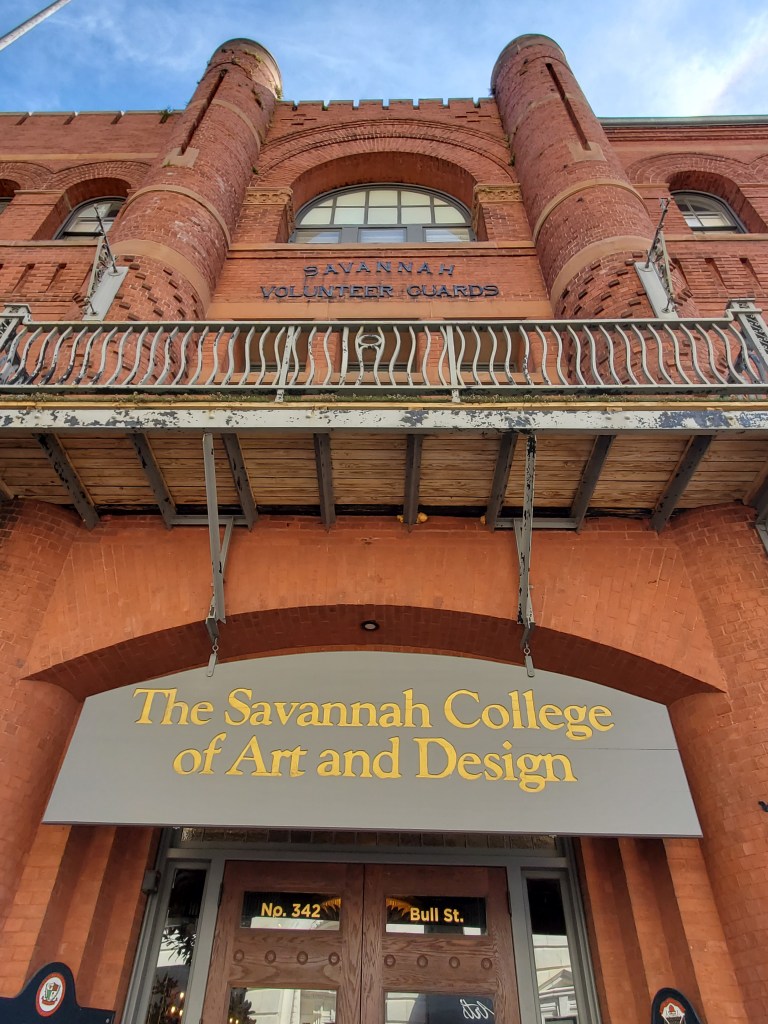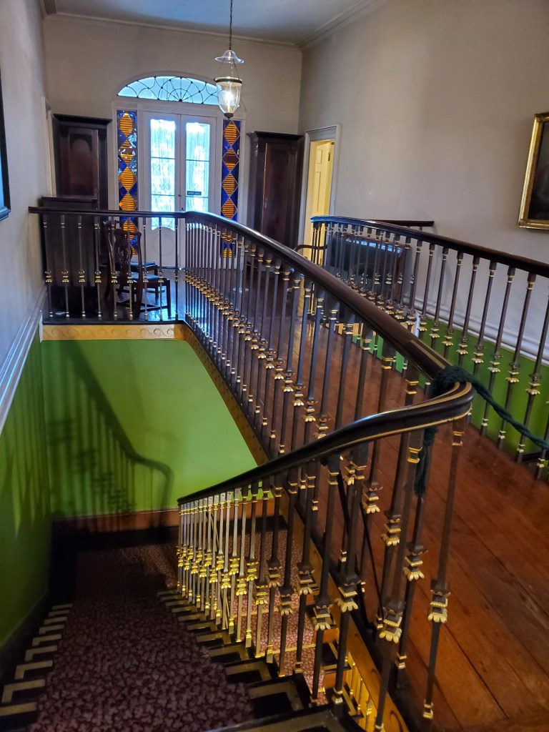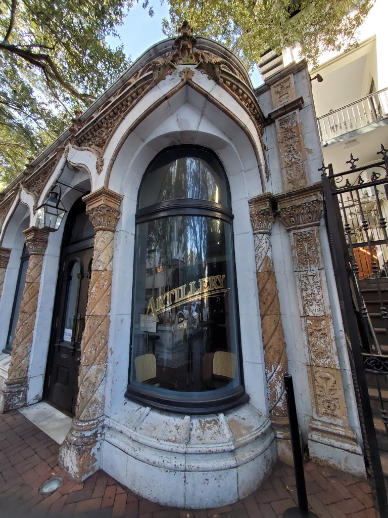 Our knowledgeable guide Jason confirmed the fun fact about porch ceiling paint Julianna had shared the day before:  “haint blue” was a color that warded off ghosts and evil spirits, at least according to the Gullah, the once-enslaved African-Americans of the low country and sea islands of coastal South Carolina and northern Georgia.  That belief came with practical value, however, as the paint’s mixture of lime, buttermilk, and indigo naturally created lye, a known insect repellent and deterrent salutary in a malarial climate.  The house tour lived up to its reputation as both informative and evocative, and admission includes access to both the Telfair Academy and the Jepson Center.