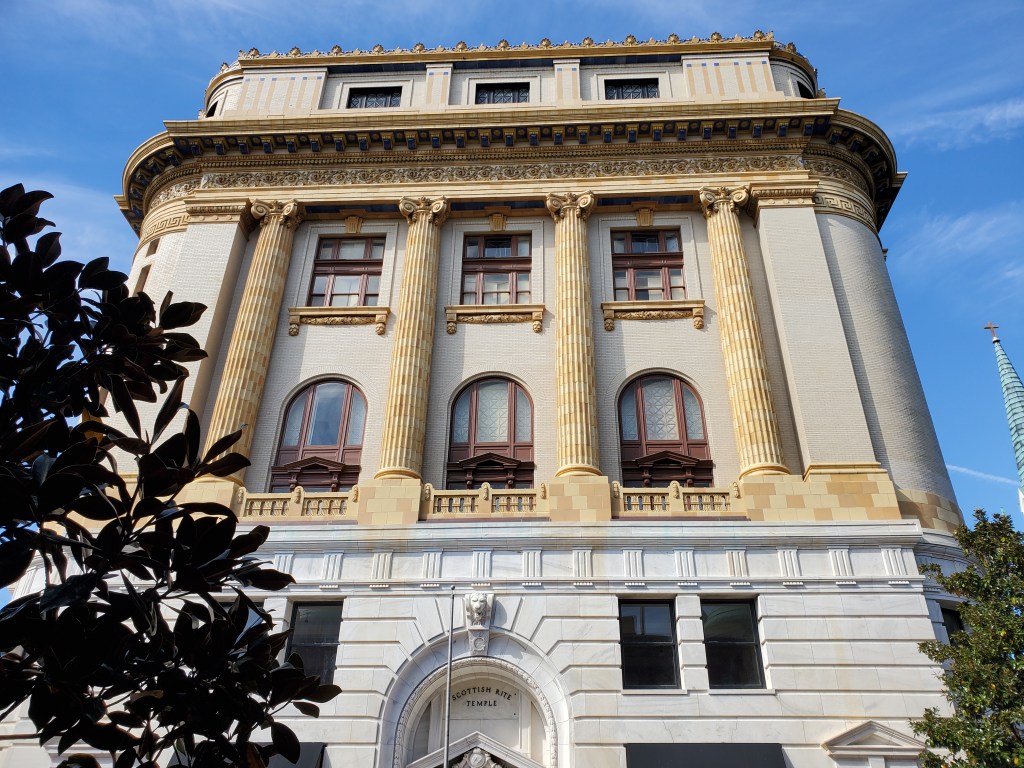 Architect Hyman Wallace Witcover’s magnificent Scottish Rite Temple (1912-23) on Bull Street, now owned by SCAD and home to the Gryphon Tea Room