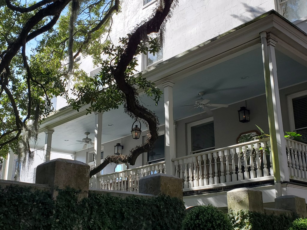 An inviting porch with haint painted ceiling on live oak-canopied Jones Street