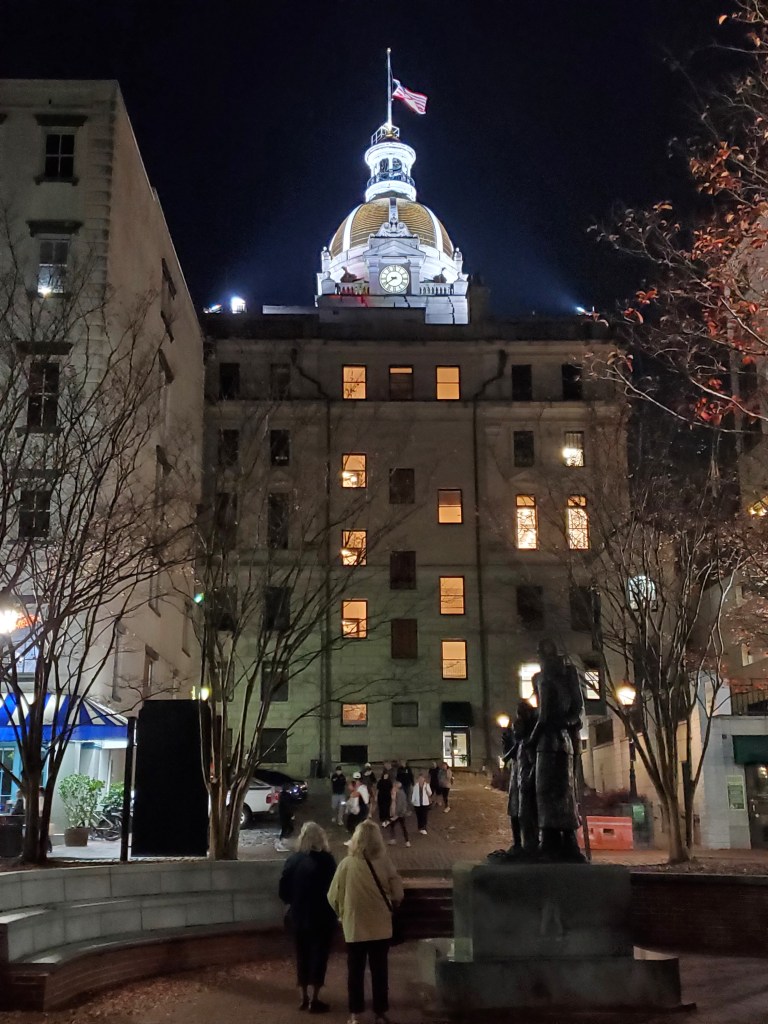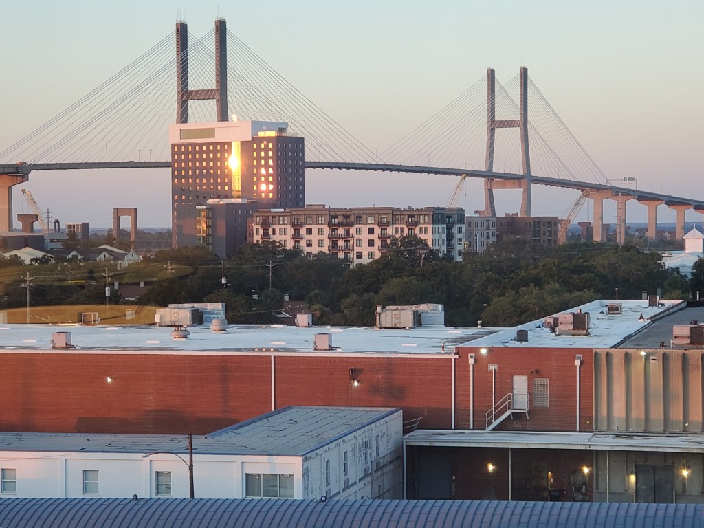 Reader, we are transported back to Georgia on Guy Fawkes day, the fifth of November.  Having driven my enormous rented Chrysler Pacifica (the “manager’s special”) back from Hilton Head to the Savannah airport (when only one person emerged from that beast, the Dollar agent was sore amazed:  “Only ONE of you?”), I was Ubered to the Embassy Suites in downtown Savannah by Stanley, humorously dressed as Santa, and on arrival was favorably impressed both by the lobby and the attentive service, offering me a lovely corner room on the fifth floor with a fine view of the Eugene Talmadge Memorial Bridge spanning the Savannah River.