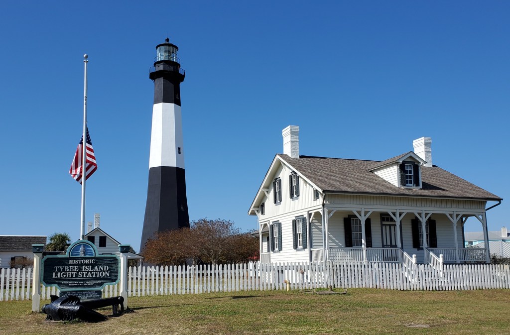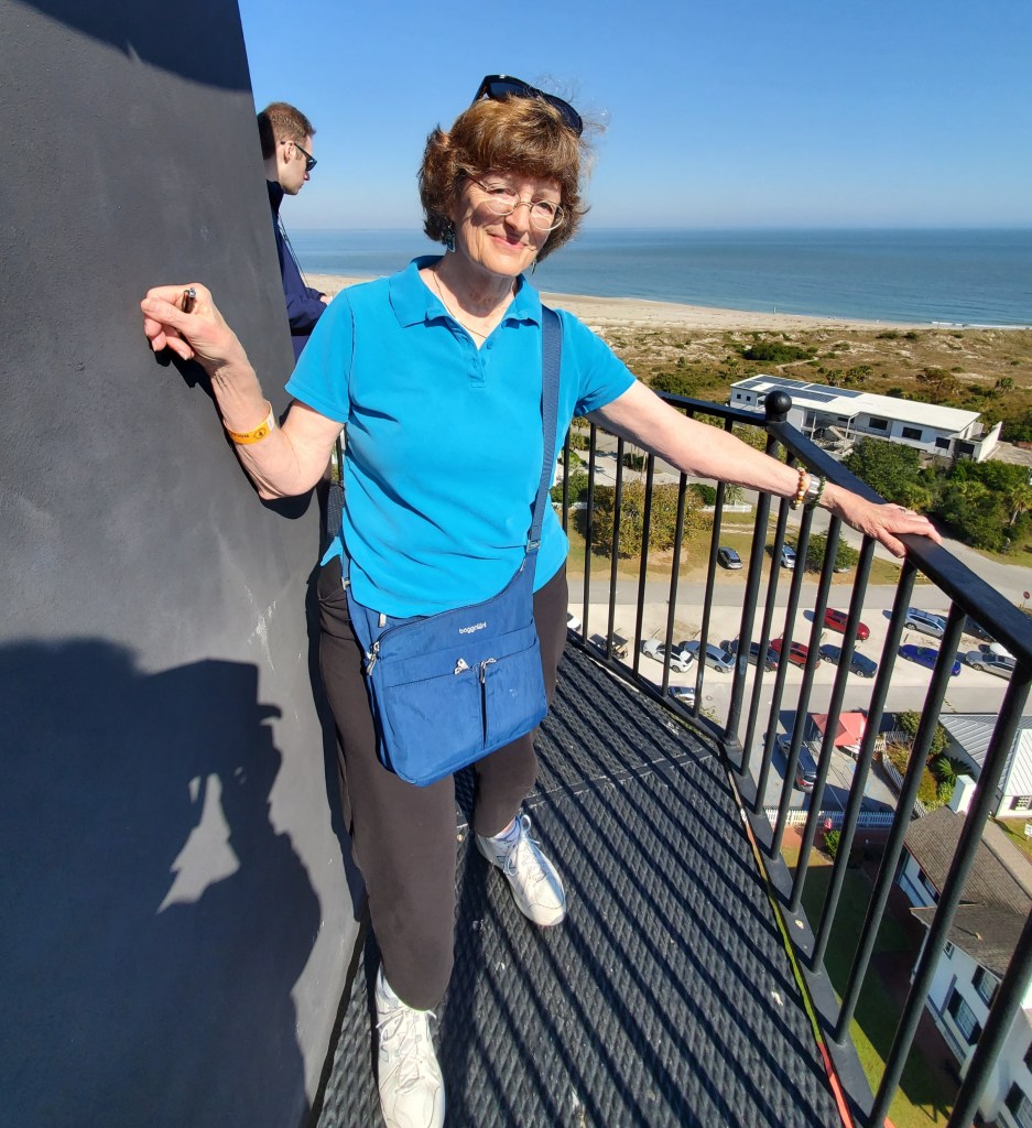 Our last full day together we drove along the causeway flanked by Spartina marsh grass to the Tybee Island Light Station and Museum for a (to me) challenging climb up the 178 steps to take in the view from the oldest and tallest (145 feet) lighthouse in Georgia, as well as a visit to the Head Keeper’s Cottage, built in 1881 and lovingly restored to the last lighthouse keeper George Jackson’s era, 1920-1940, with some of the family’s original belongings.