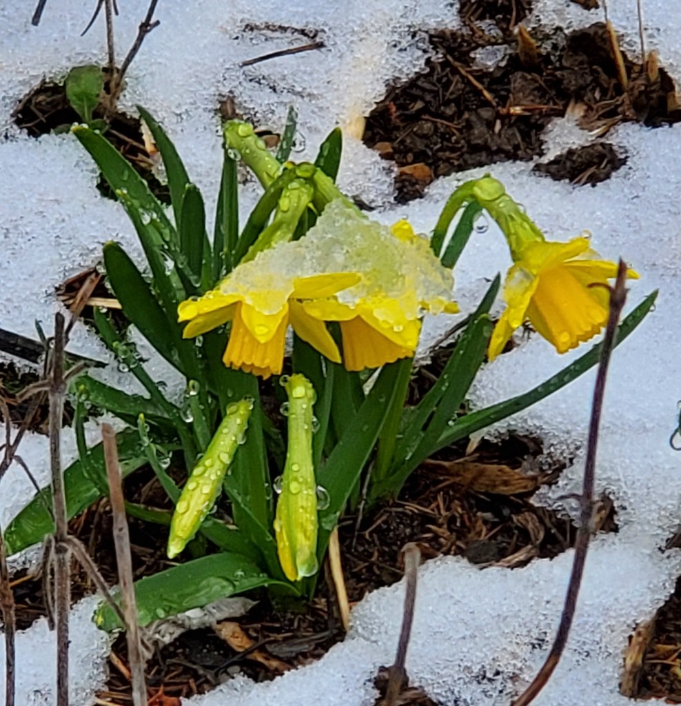 Then came the comforting company of long-standing friends celebrating with a communal feast all the season’s hopeful renewals, sacred and secular. We all contributed—my now traditional offering was once again deviled eggs—and enjoyed both new acquaintances and catching up with the old, a gathering bracketed by the long drive separating Madbury NH from Newton MA where the daffodils are already in bloom.