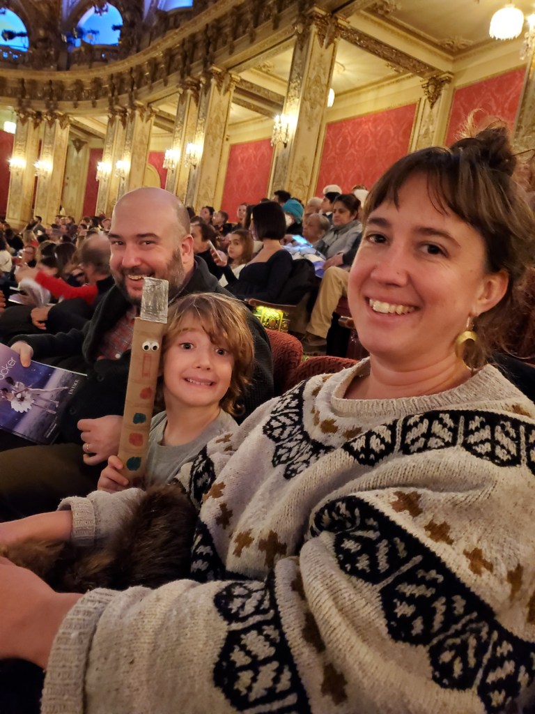 The Citizens Opera House holds 2677 souls, and so there was another crush negotiating the metal detectors into the lobby. But Leo needed to make a stop at the box office. Knowing that we would be treated to a backstage tour after the show—my friend Elizabeth Olds is assistant to Boston Ballet’s artistic director, Mikko Nissinen—Leo had constructed a nutcracker out of a paper towel tube supplied with googly eyes and drawn-on peppermints alternating red and green for buttons. This he hoped to give to the REAL Nutcracker Prince after his performance. But one of the googly eyes had come off. So with help from box office staff and patient dad Peter, who showed his son how to make single-sided tape double-sided, Leo restored his paper nutcracker’s sight and we made our way up the several flights of stairs to left balcony B. Heroic Anne arrived from the parking garage just as the lights were dimming and the magic began, Leo clasping his nutcracker.