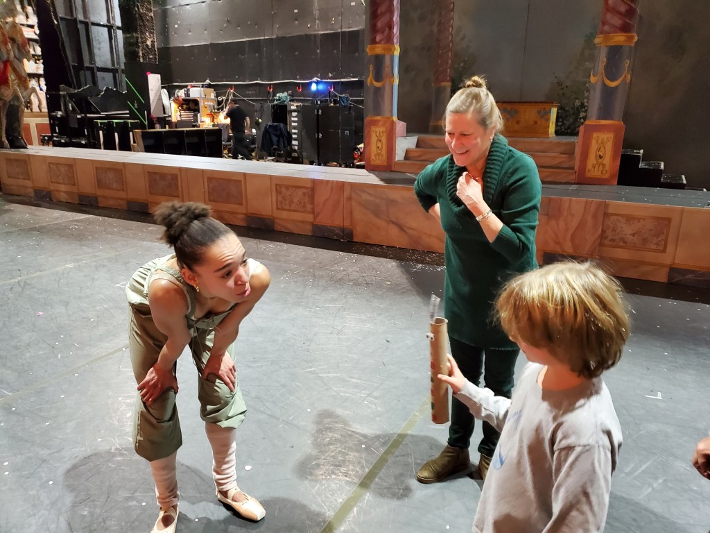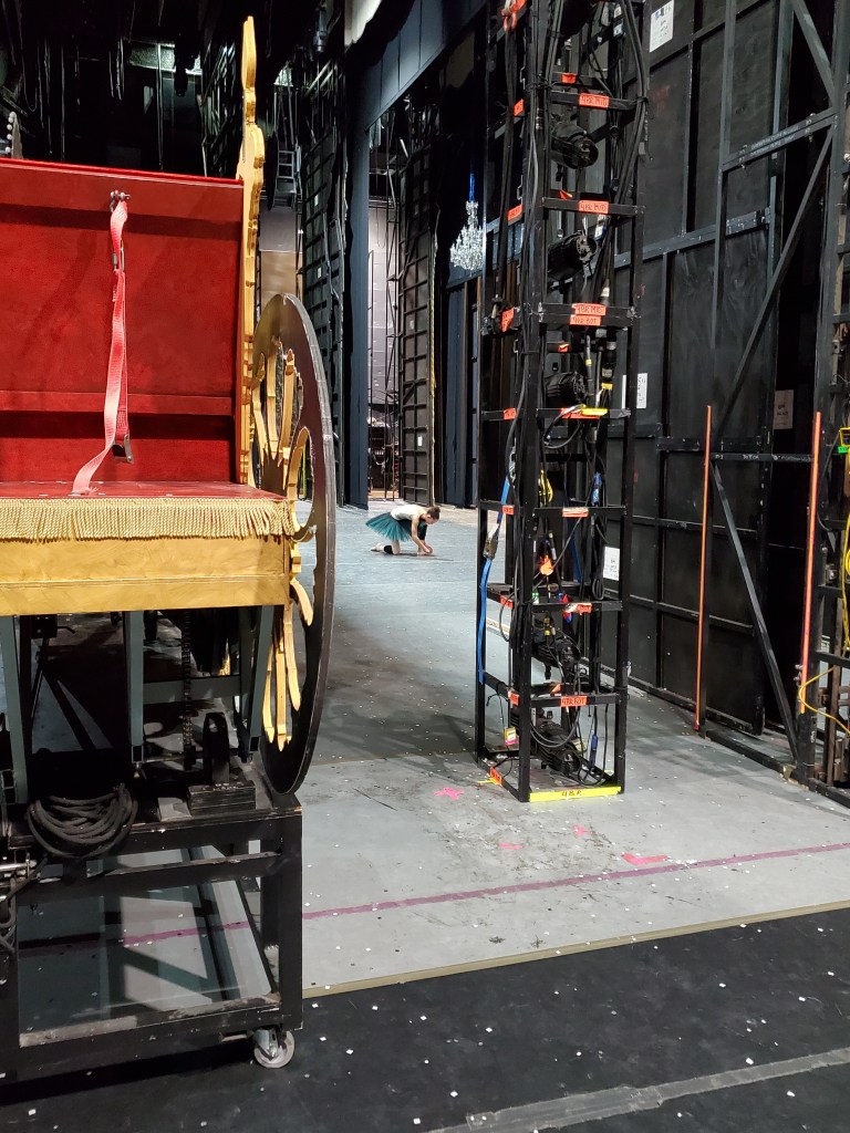 As the audience streamed for the exits, we descended to the bottom stage left exit from the balcony where Elizabeth, former principal dancer in the Royal Winnipeg Ballet and herself once a Sugar Plum Fairy, met us and showed us in sequence the Queen’s Box (terrible sightlines!), the snowflake remnants littering the wings (some of the little squares are mylar for sparkle), the prop table with Clara’s crown on its cushion. (How does it stay in place, both on the cushion and on Clara’s head? Magnets!). Chyrstyn Fentroy, soon to be that evening performance’s Sugar Plum Fairy, was warming up, and kindly stopped to inquire about the nutcracker Leo held. We posed on stage. The view from there is an epiphany.