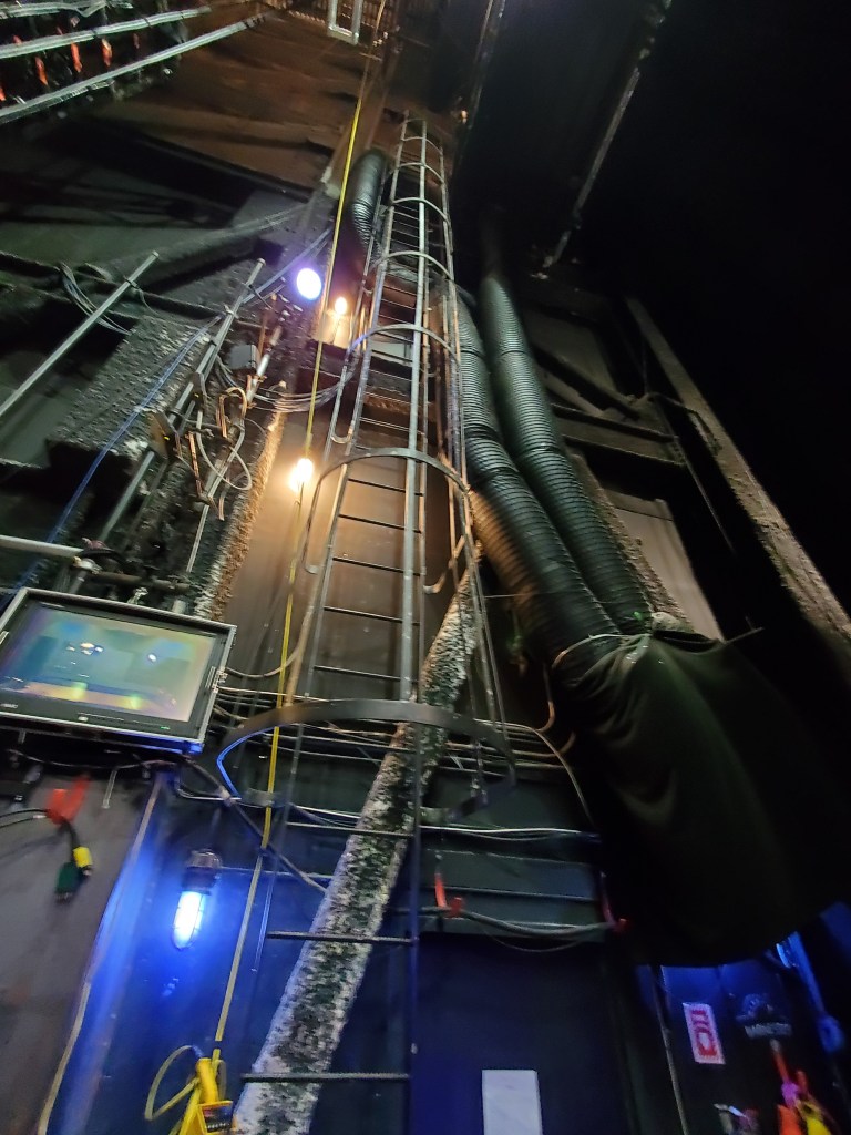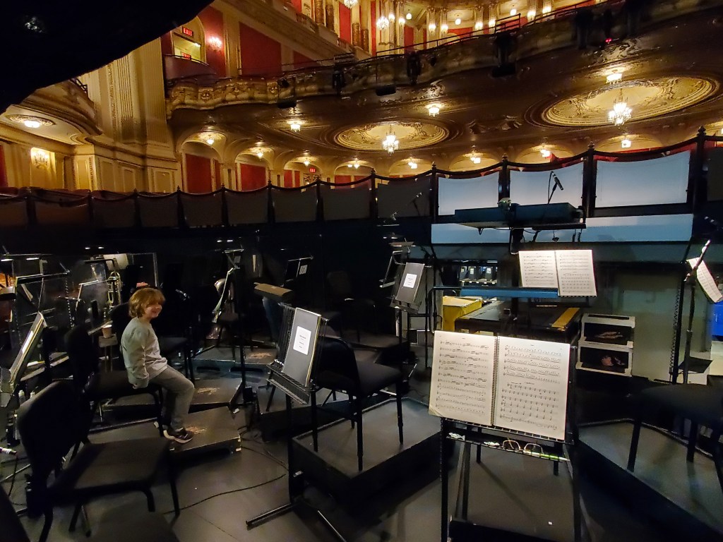 The perilous path to the grid Stage right we saw the steps Mother Ginger has to climb to step into his stilts, directly below the rigging that lowers his 40-pound costume around him so all the Boston Ballet School students can hide beneath “her” skirts. Then to orchestra pit, where we got the conductor’s view of the house as well as the music and some instruments left behind till the next show, and learned the trick of the children’s chorus in the snow scene (the organ, not the kids!). The stage manager’s screen glowed, and Ms. Fentroy explained the purpose of the rosin she was applying to her pointe shoes (the better to avoid slipping) before rehearsing her upcoming pad de deux. I learned that the Opera House remains a “hemp house,” still using the centuries-old tradition of using ropes, pulleys, and counterweights to fly the scenery—by hand! And then, suddenly, there was the Nutcracker Prince, out of costume and appearing as himself, Yue Shi, graciously accepting Leo’s gift of the nutcracker and posing for a memento photo.